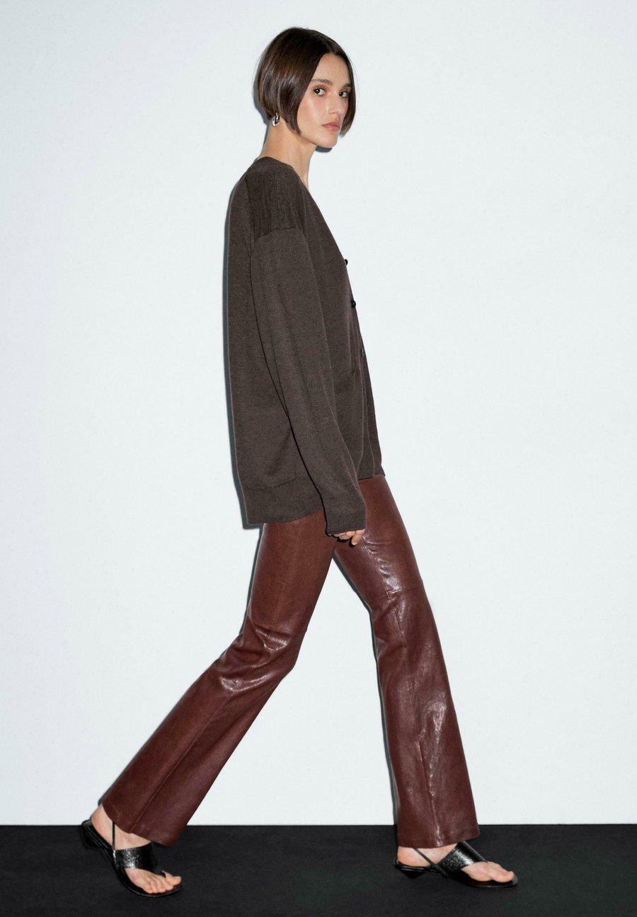 V-образный вырез. Два прорезных кармана. Длина изделия больше обычной. Ребристая отделка. Длинные рукава. Кардиган из трикотажной ткани из смеси льна. Застежка на пуговицы спереди. Вырез горловины: Низкий V-образный вырезМатериал и уход