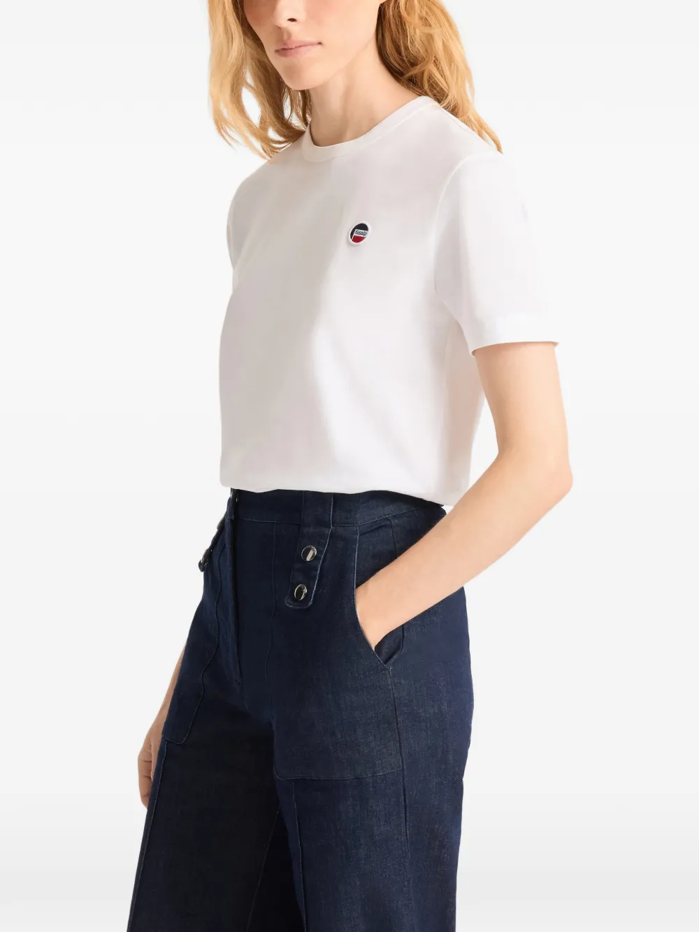 Белая футболка с круглым вырезом, короткими рукавами и нашивкой на груди