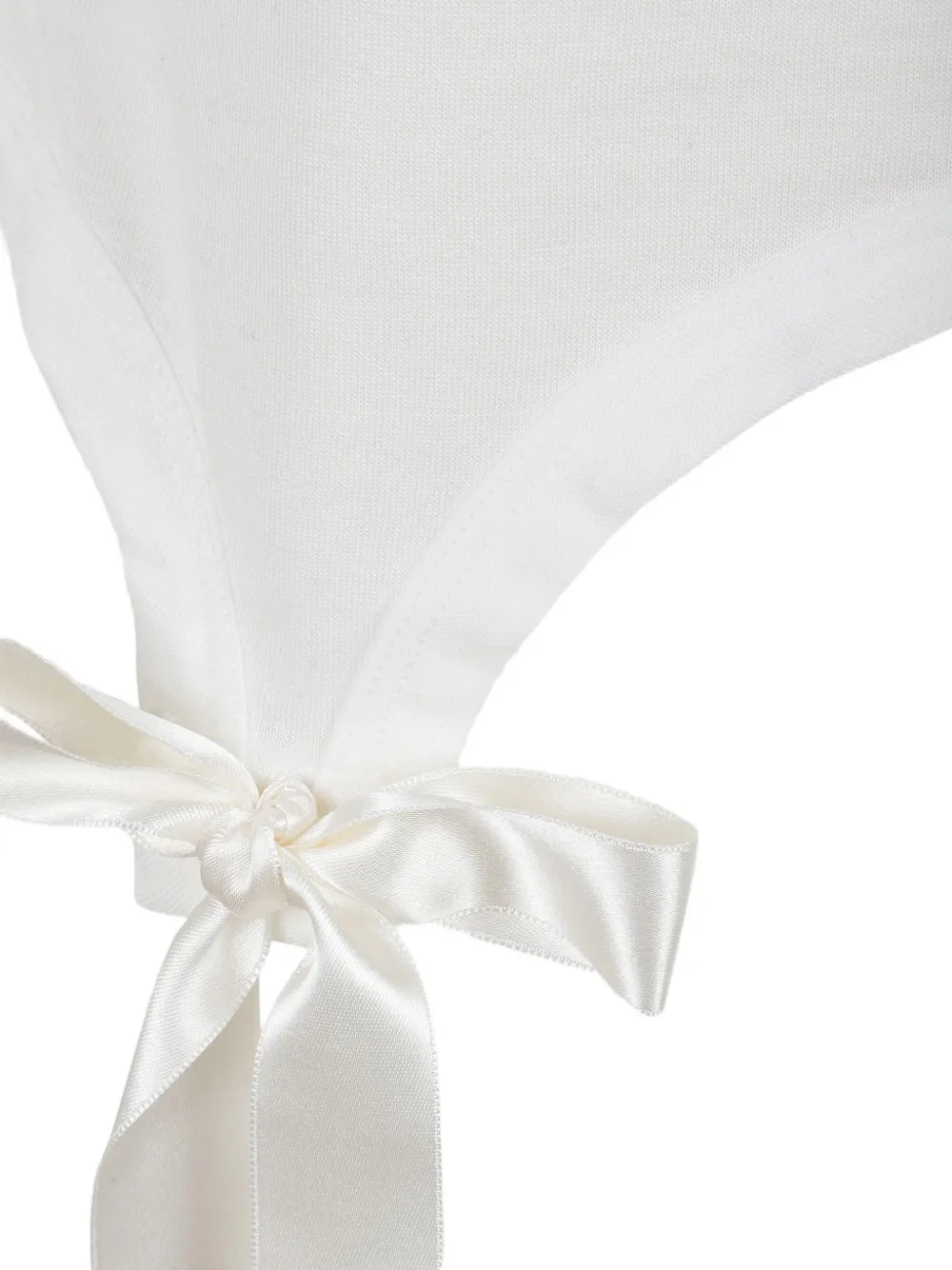 Белая отделка лентой, бант, короткие рукава, круглый вырез