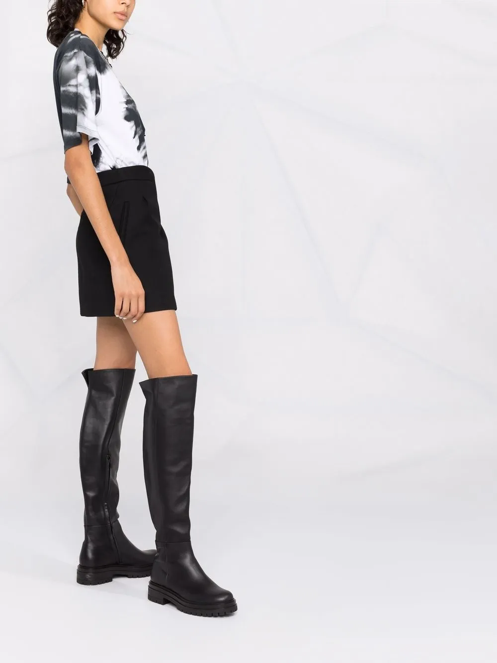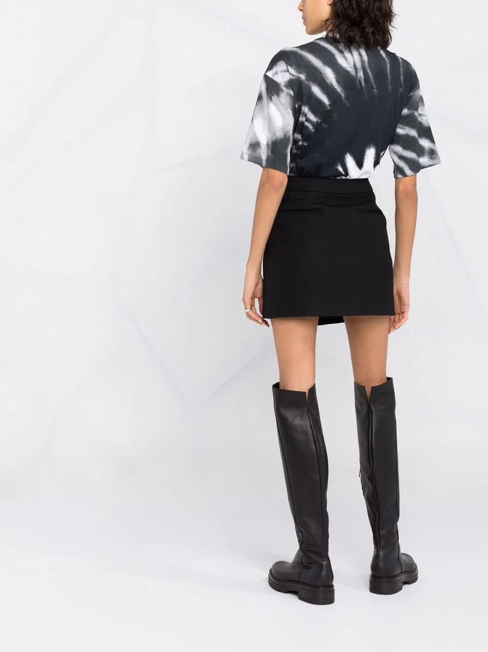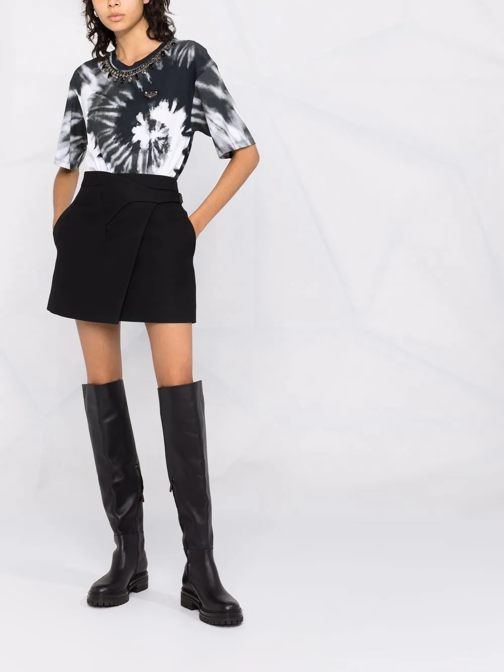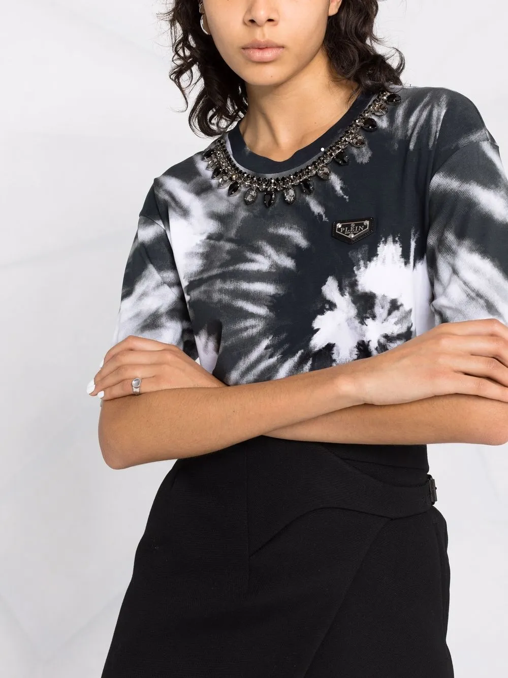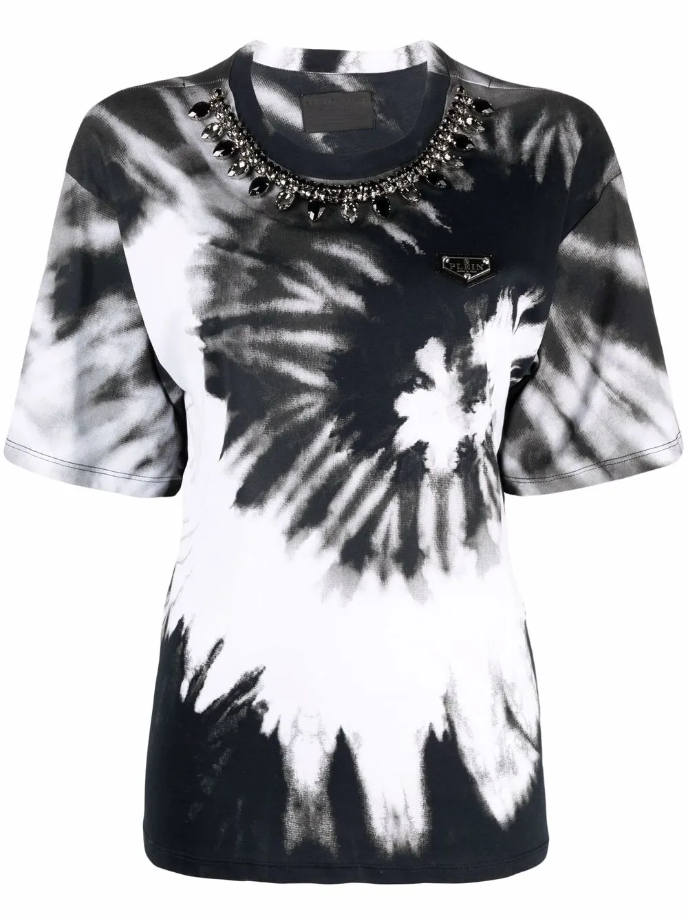 Принт тай-дай, декор из кристаллов, металлический логотип, круглый вырез, короткие рукава и прямой подол.