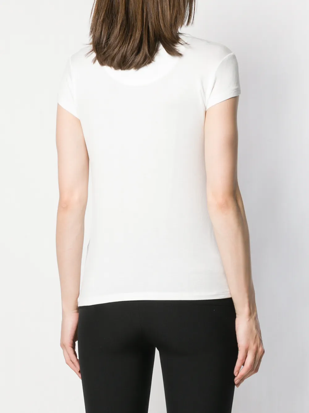 Круглый вырез, короткие рукава и пряжка с логотипом спереди.