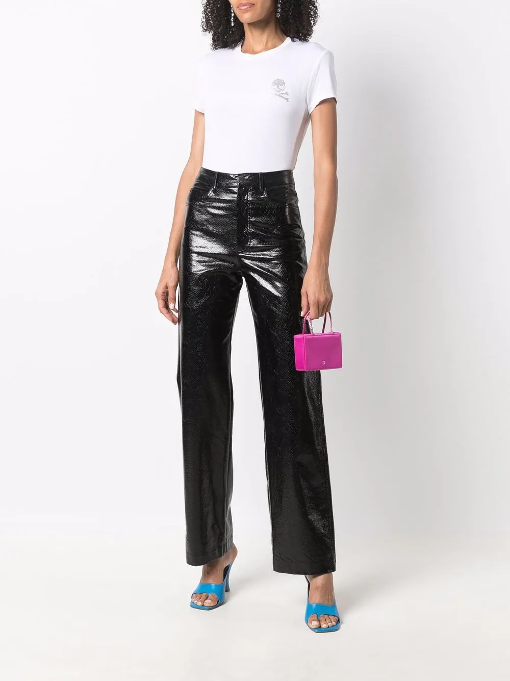 Украшения из горного хрусталя, нашивка в виде черепа, нашивка с логотипом сзади, круглый вырез, короткие рукава и прямой подол.