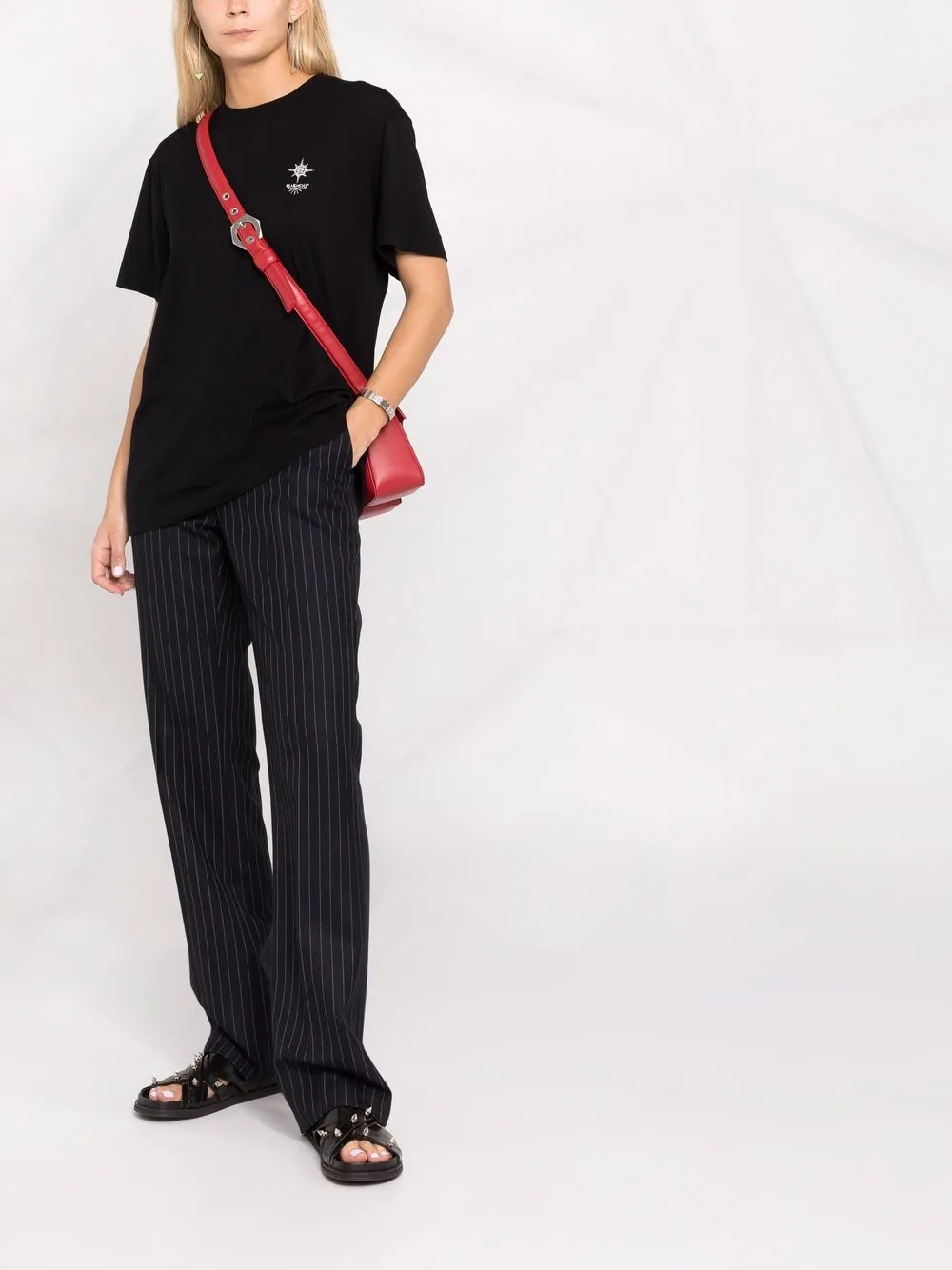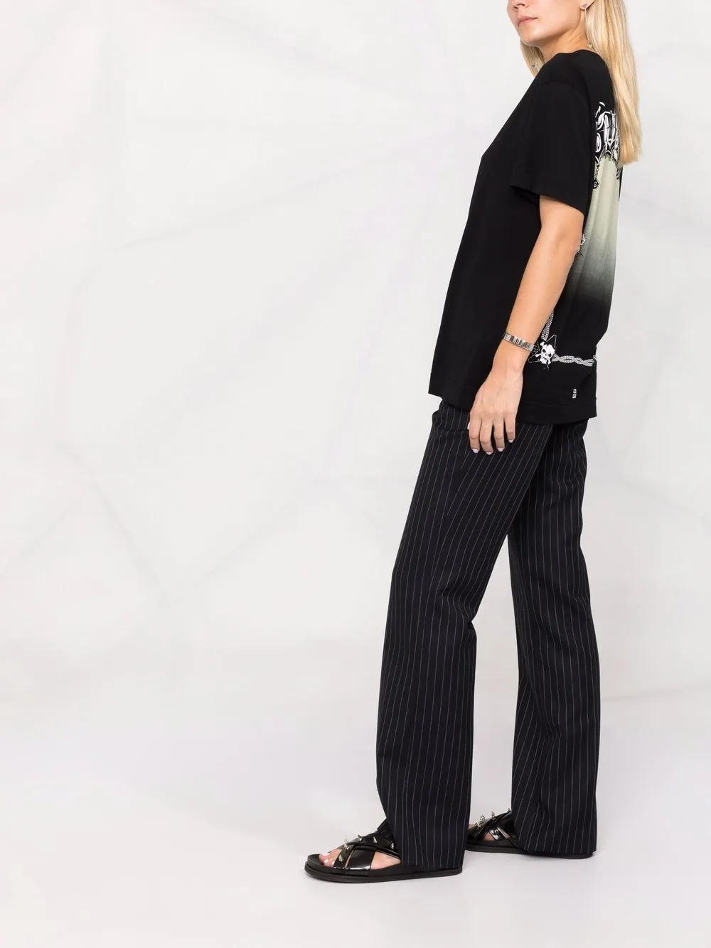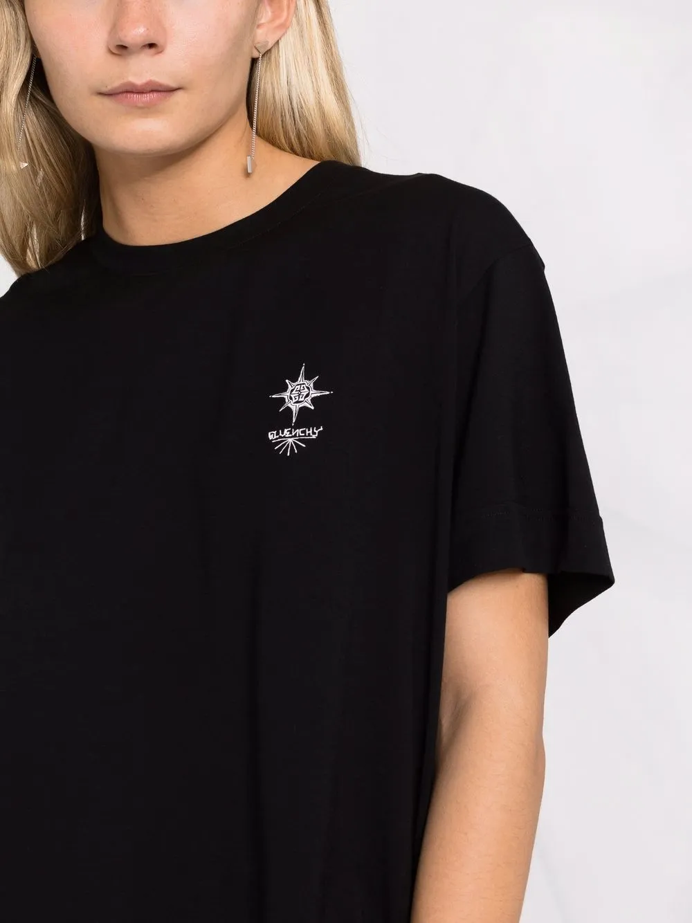 Принт с логотипом на груди, графичный принт на спине, круглый вырез, короткие рукава и прямой подол.