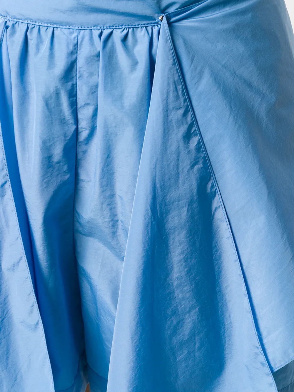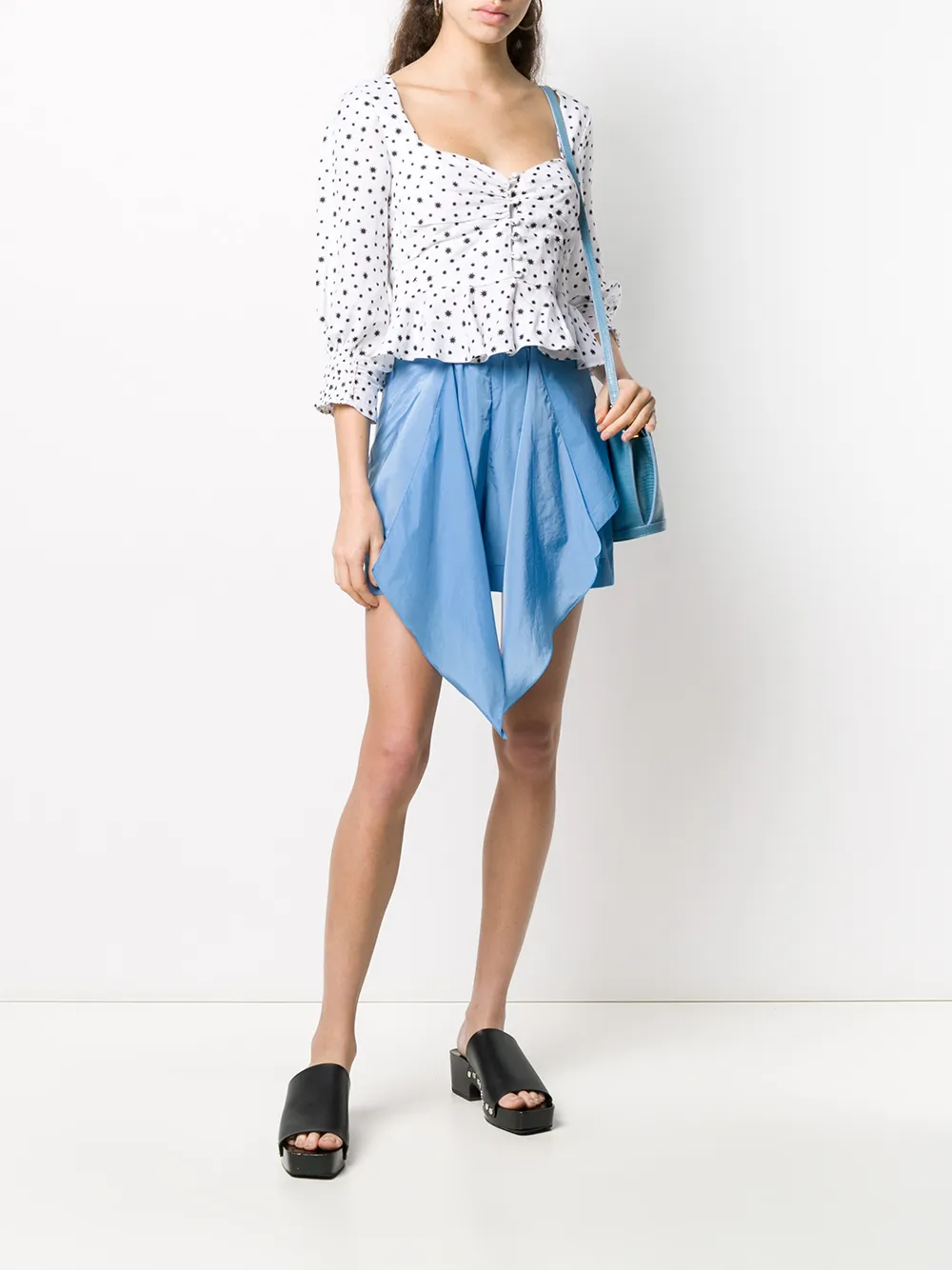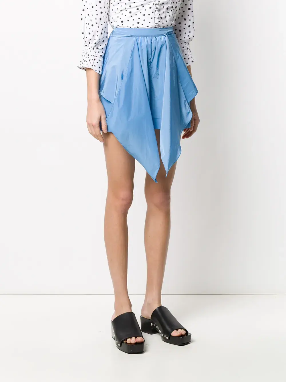 Завязки спереди, завышенная талия, свободный крой и два прорезных кармана по бокам.