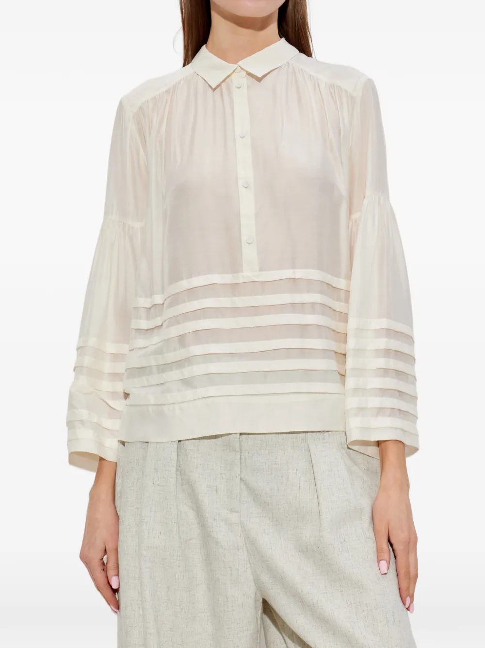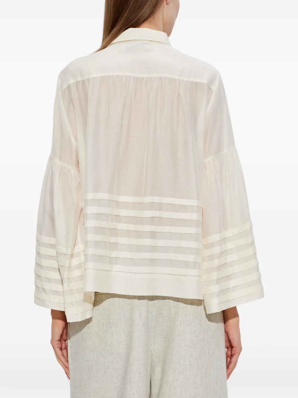 Цвет слоновой кости, застёжка на пуговицы, расклёшенные рукава, полупрозрачная
