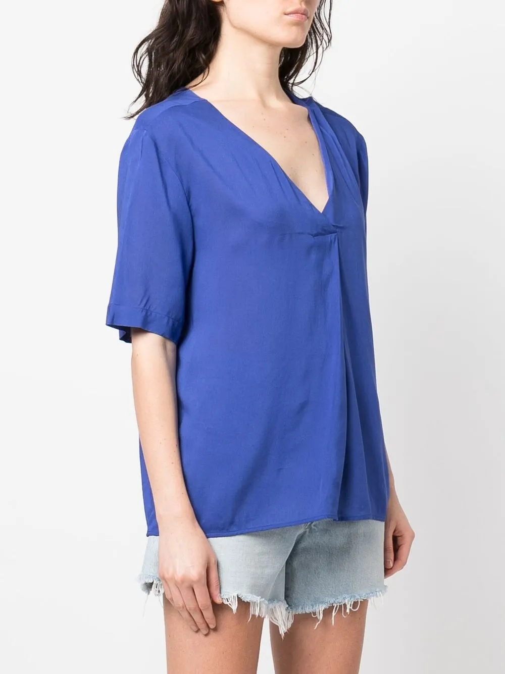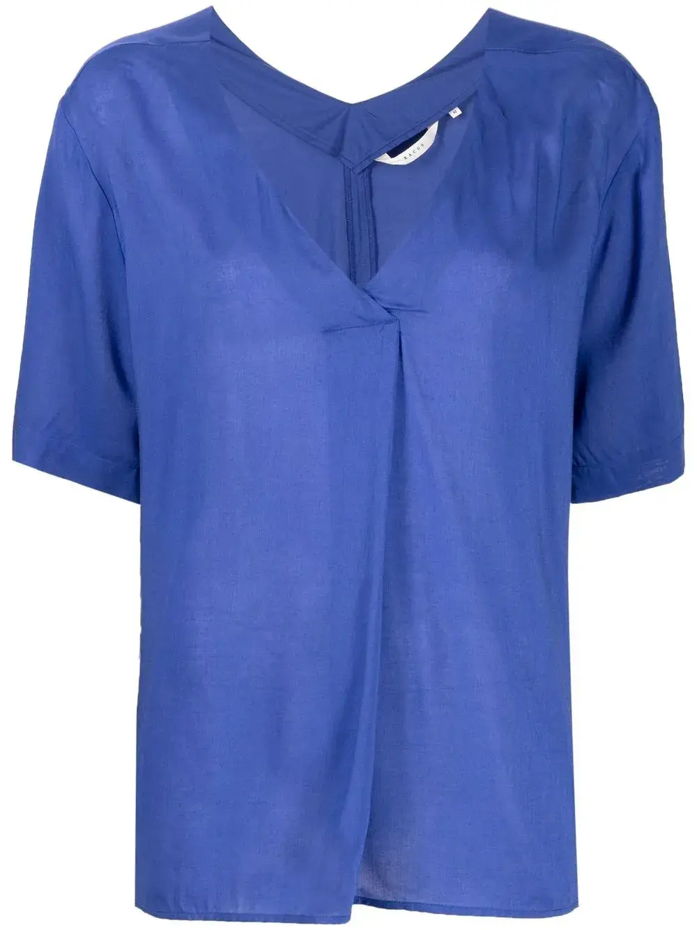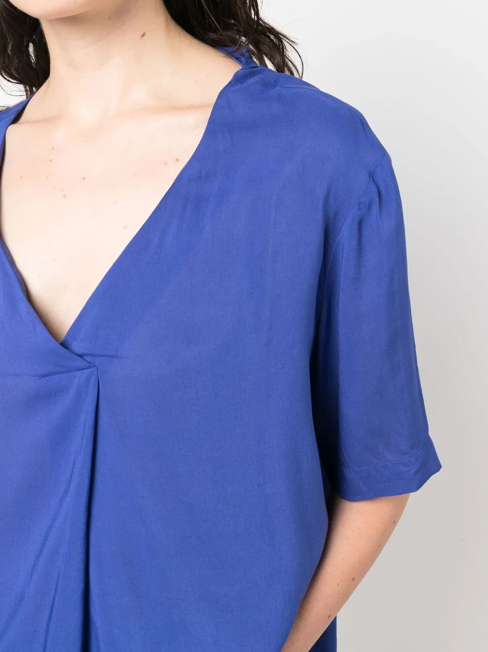 Синий, легкий материал, V-образный вырез и короткие рукава.