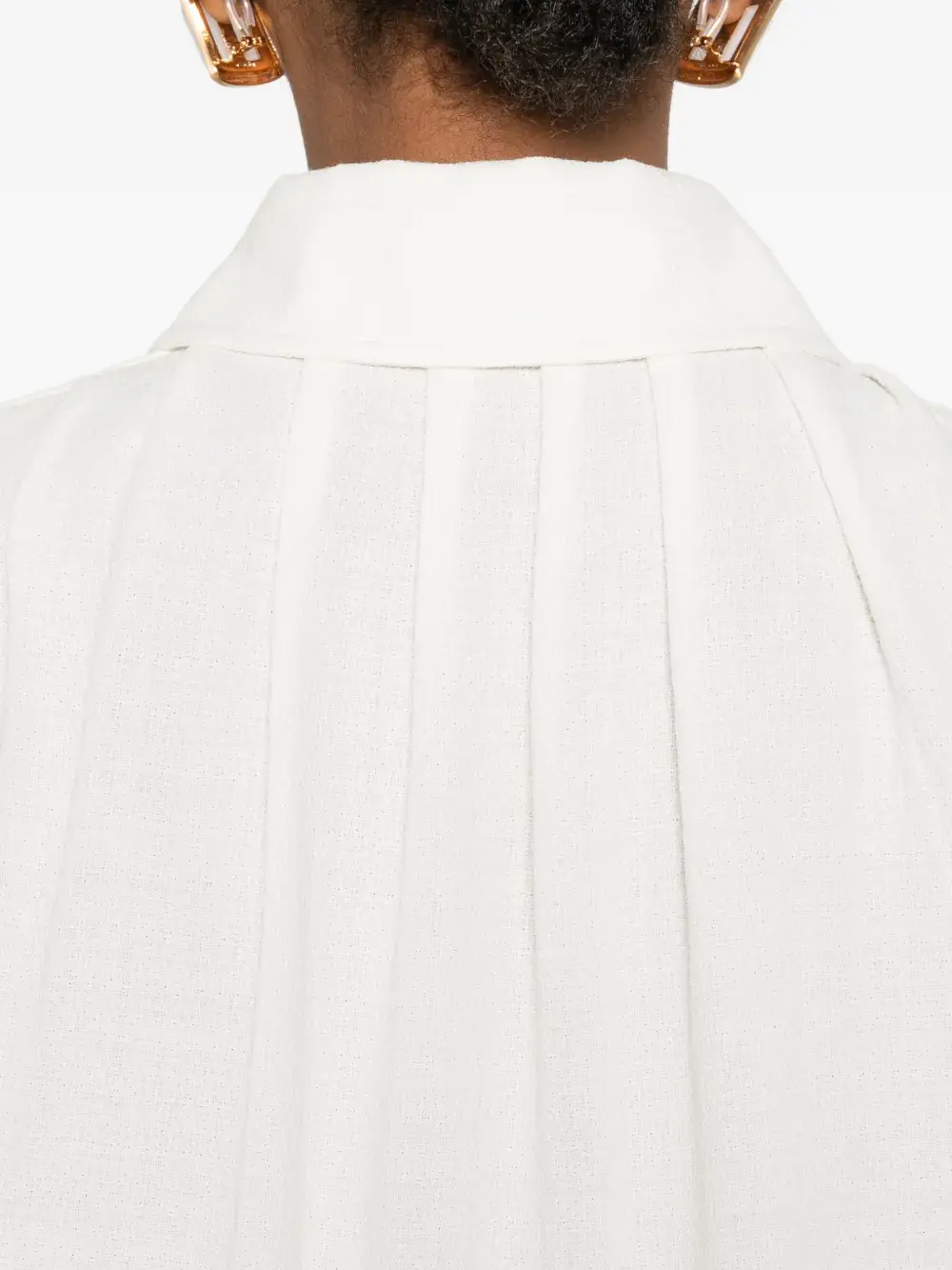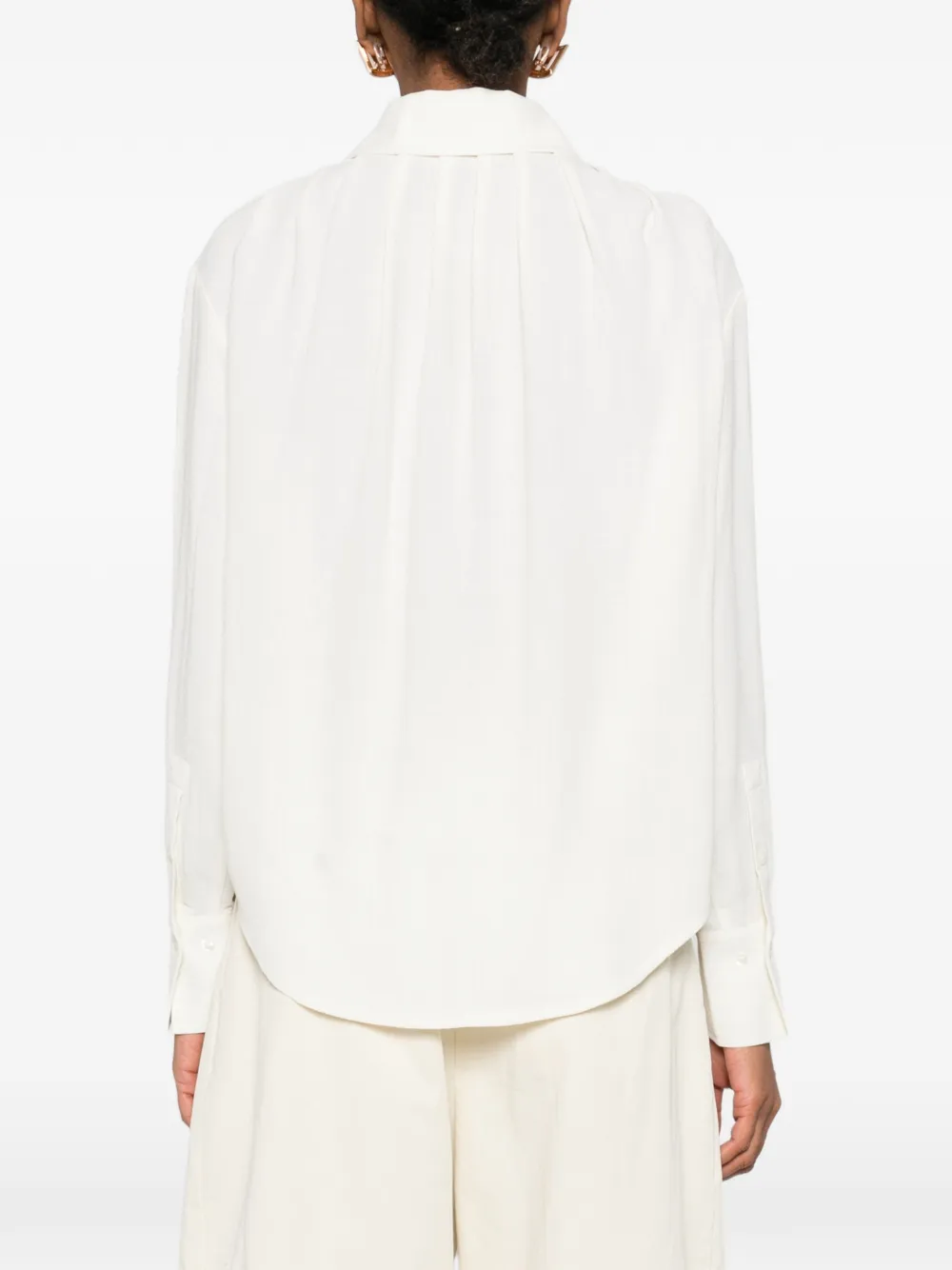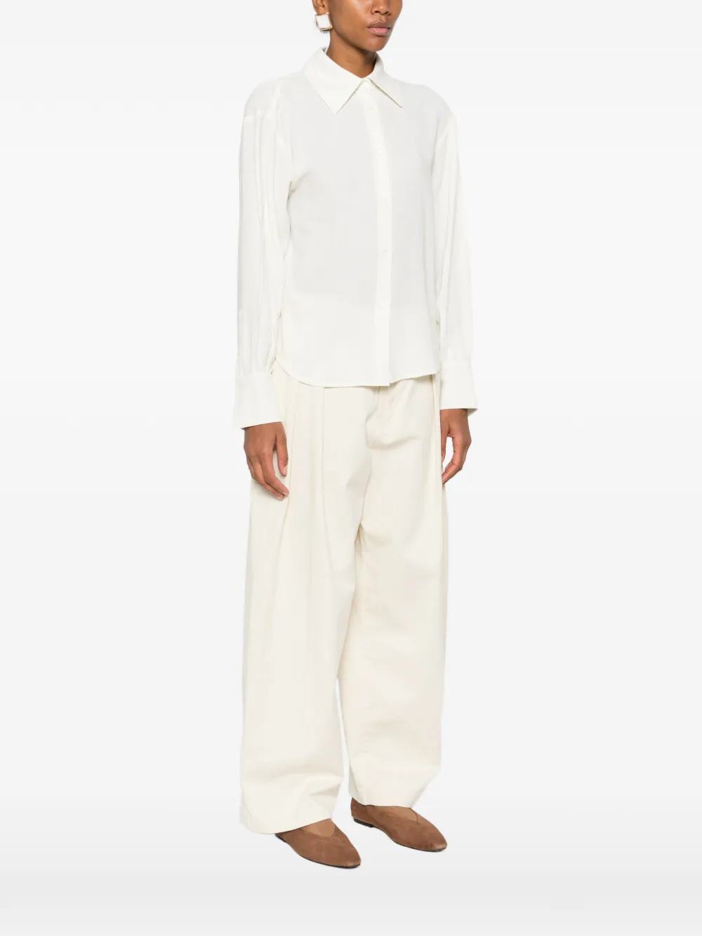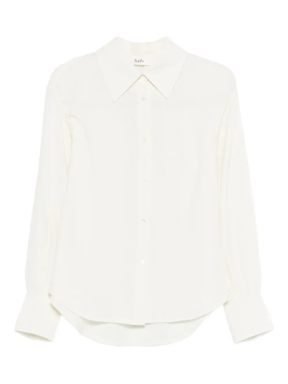 Бежевый цвет, застёжка на пуговицы, длинные рукава, заострённый воротник