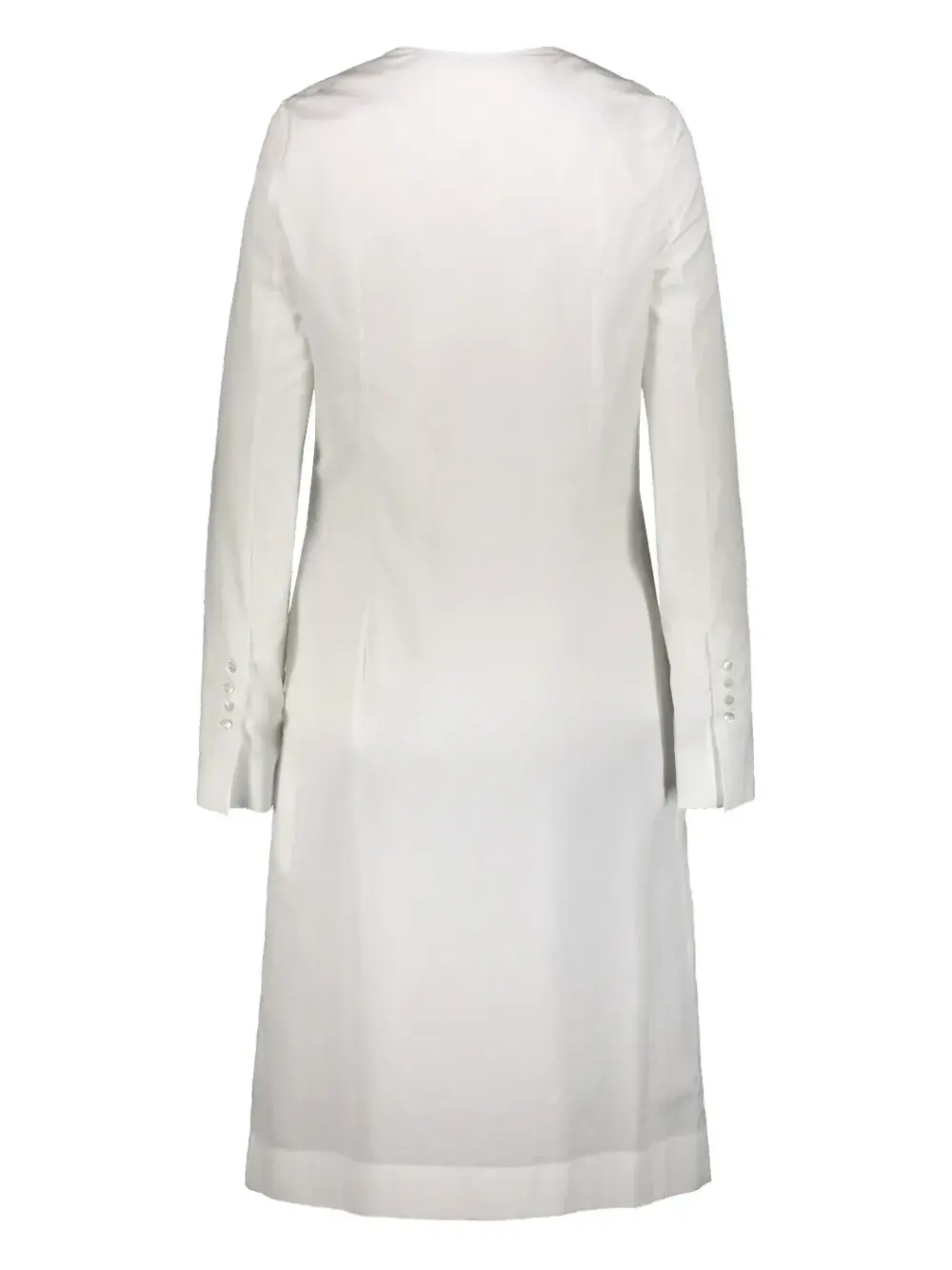Белый цвет, нагрудные карманы, манжеты на пуговицах, передняя застёжка на пуговицах до середины, длинные рукава