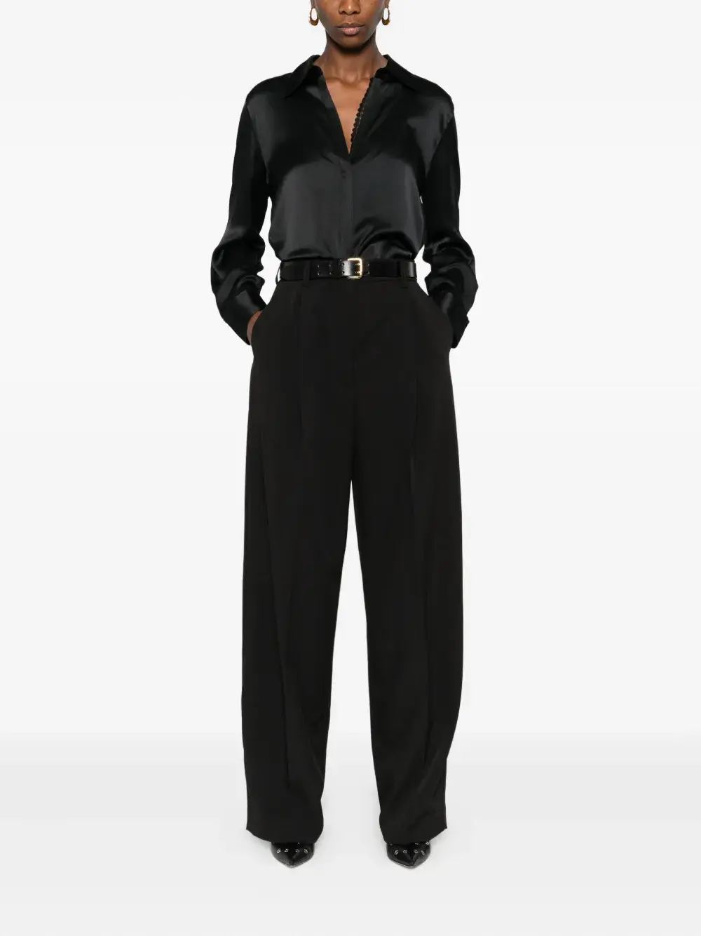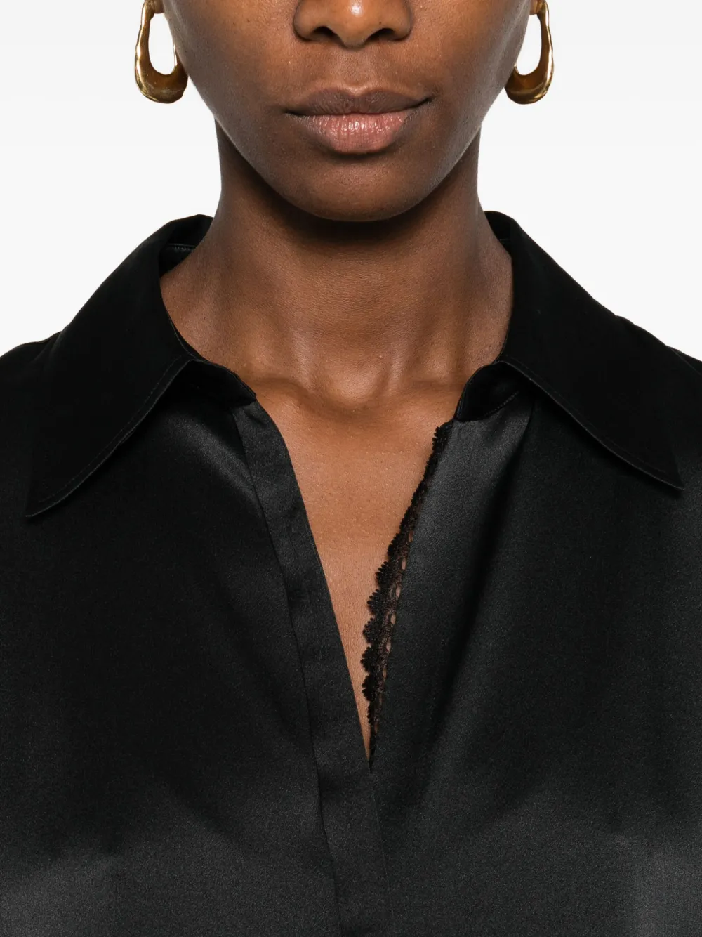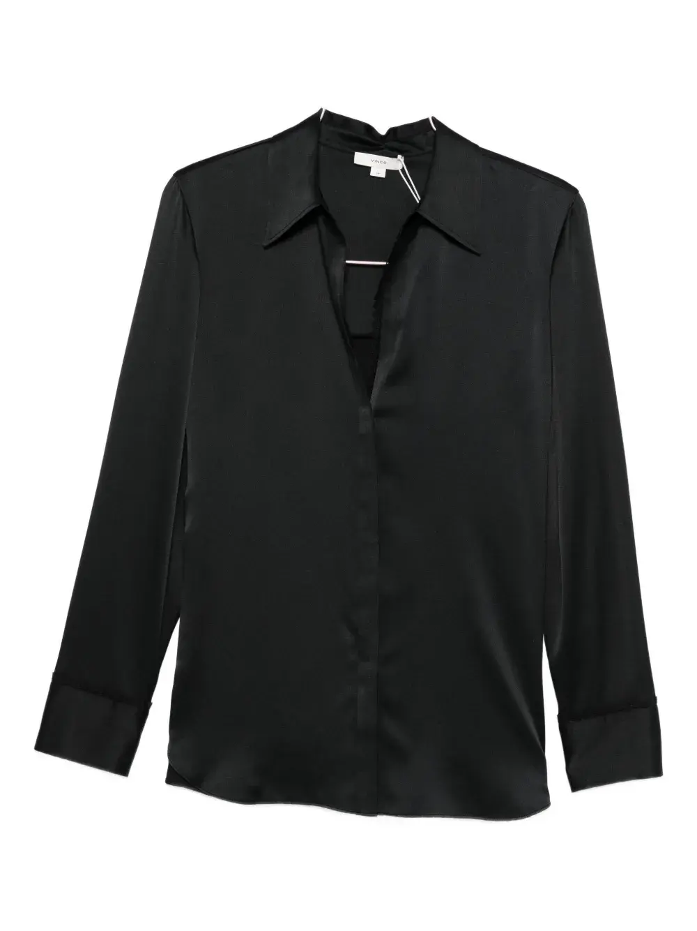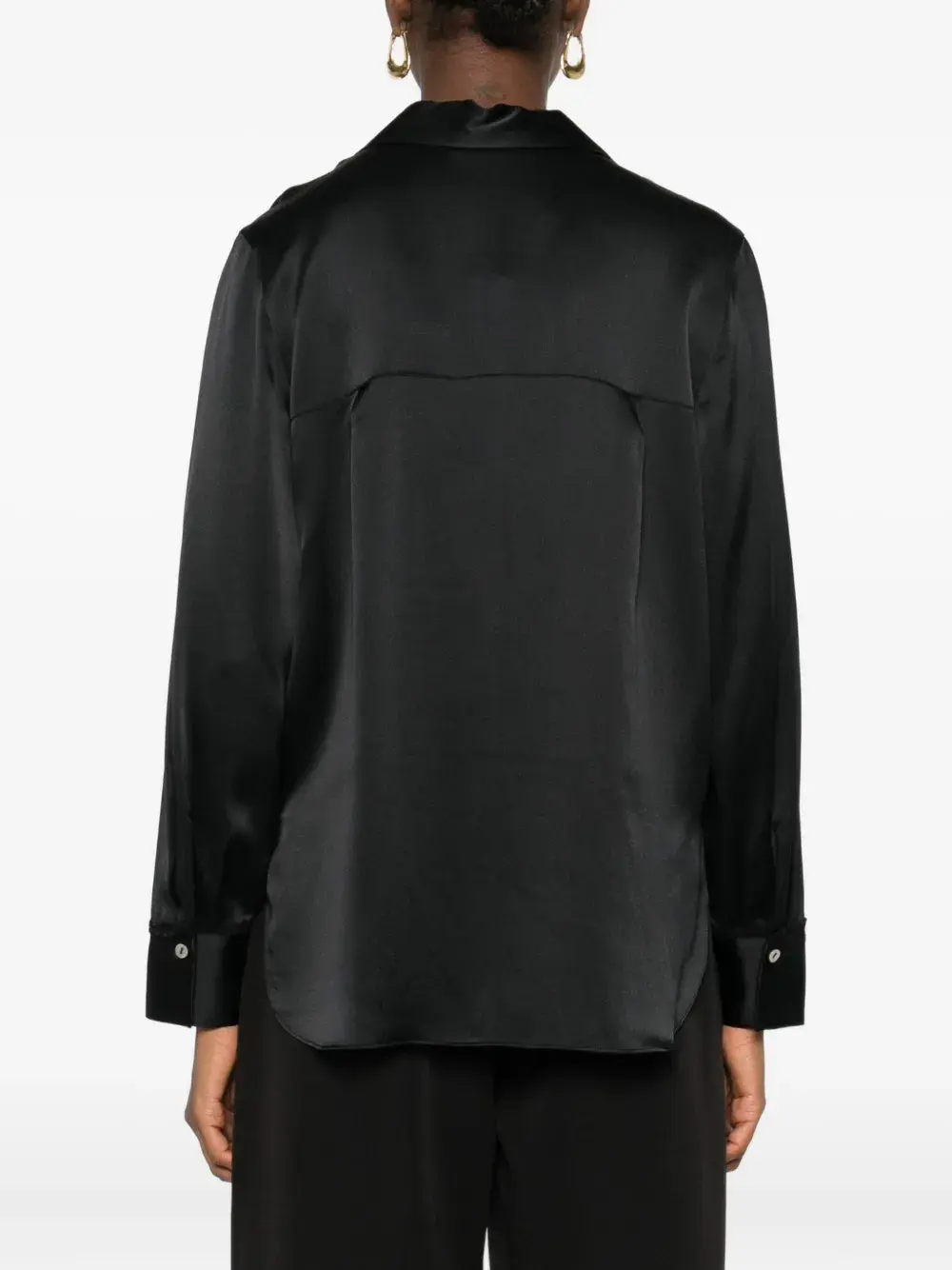 Черная сатиновая фактура, рукава три четверти, воротник с отложным краем, застежка на пуговицы спереди, прямой низ