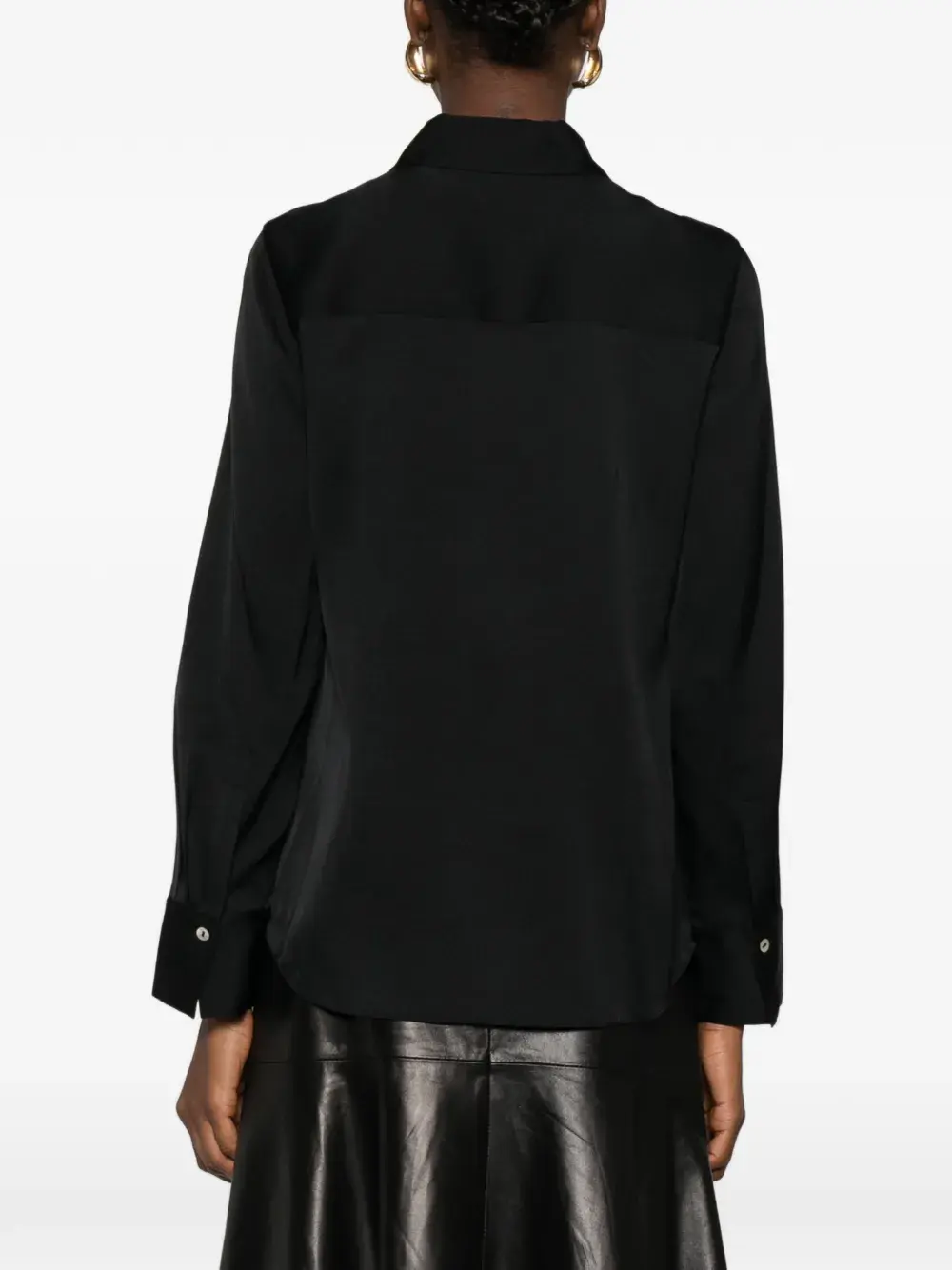 Чёрная рубашка с застёжкой на пуговицы, длинными рукавами, манжетами на пуговицах, классическим воротником и прямым подолом