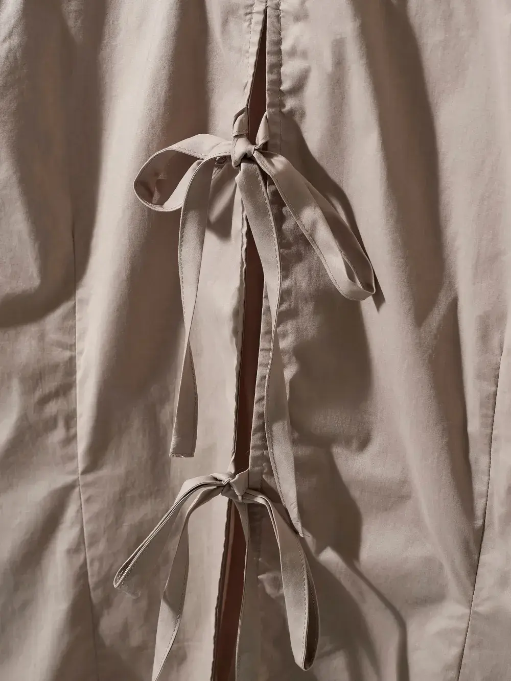 Тауpe (серо-коричневый) цвет, застежка на пуговицы сзади, бант сзади, длинные рукава, манжеты на пуговицах