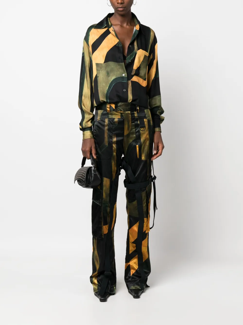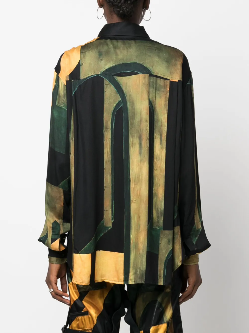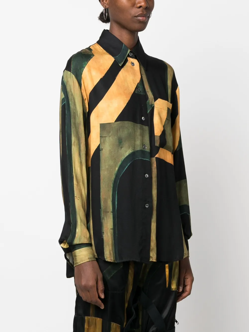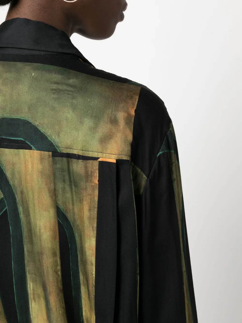 Черный/разноцветный, абстрактный принт, прямой воротник, застежка на пуговицах спереди, длинные рукава, манжеты на пуговицах, закругленный подол и неравномерный подол.