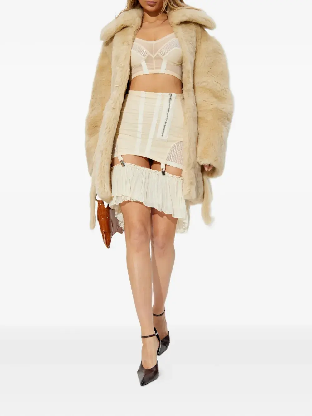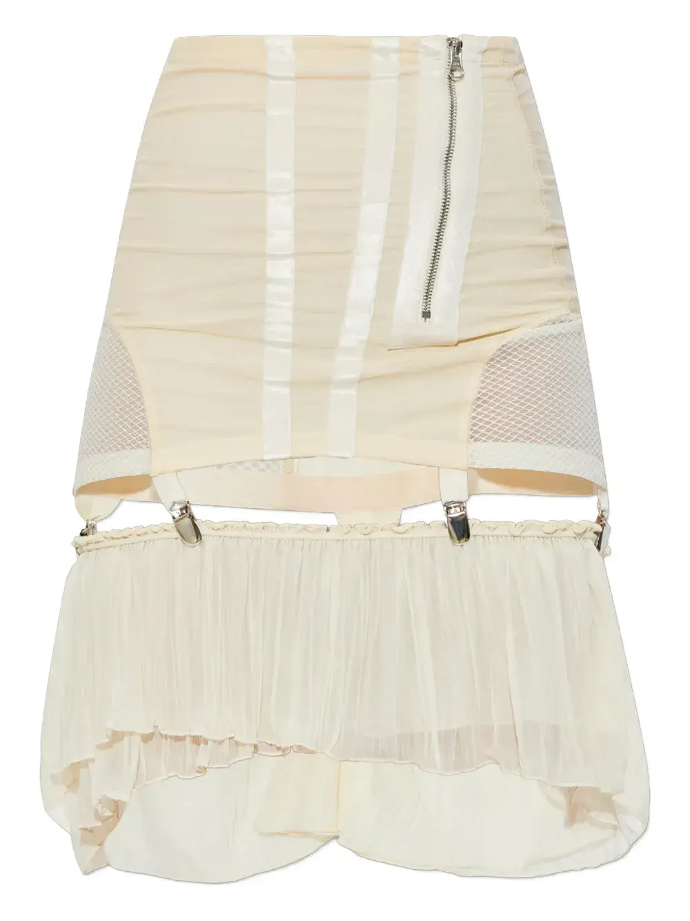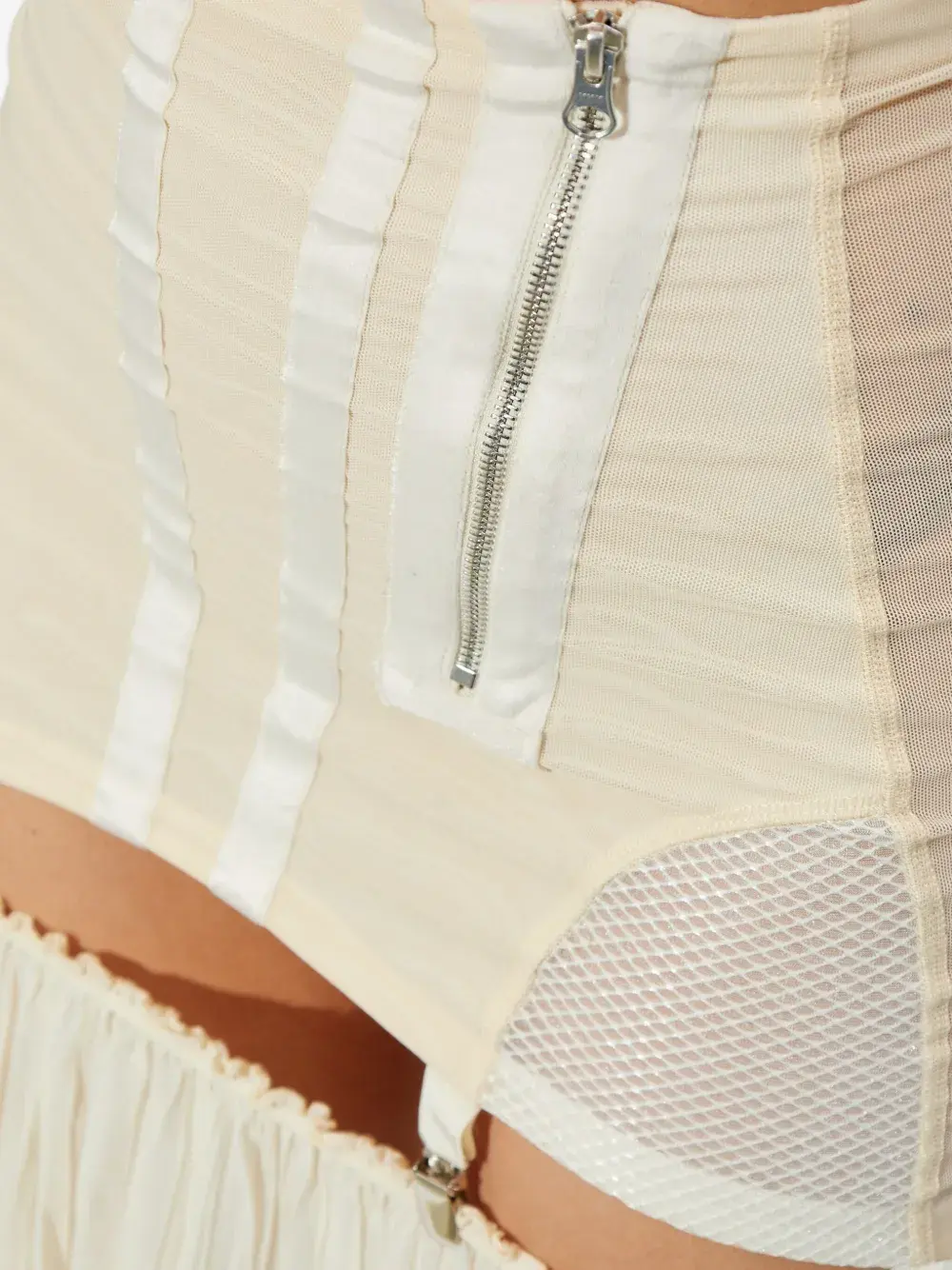 Светло-бежевый цвет, отделка молнией, воланистый подол, сетчатые вставки, застёжки-клипсы, многослойная конструкция