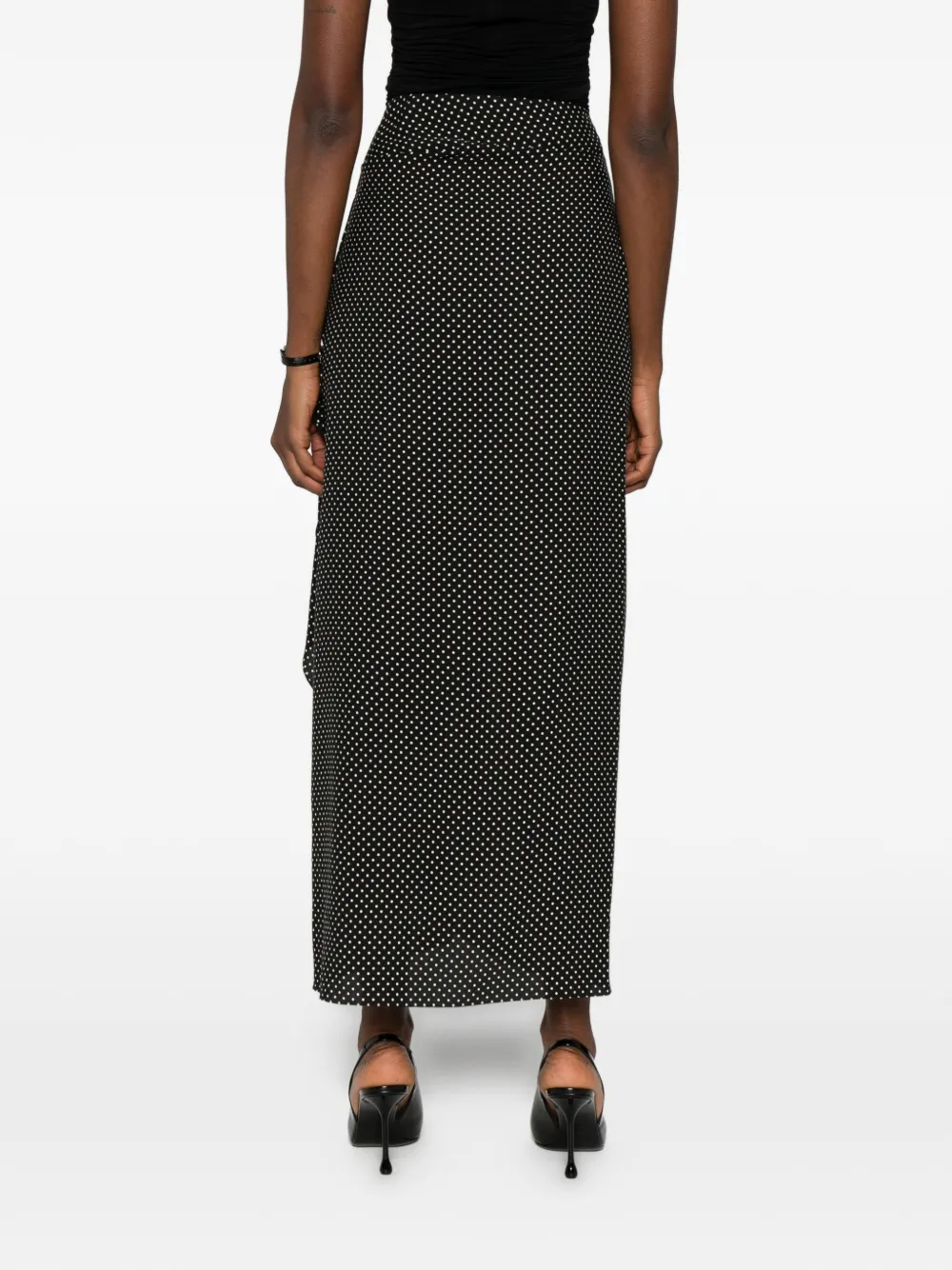 Чёрная юбка-карандаш с принтом в горох, пряжкой, драпировкой и запахом