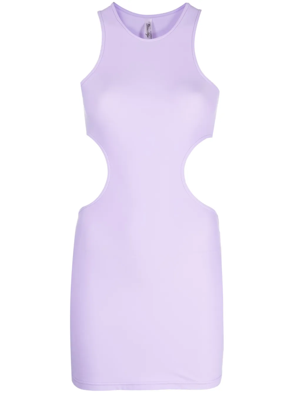 Лиловый, эластичный материал, вырезные детали, круглый вырез, узкие бретели, без рукавов, вырез рейсер и длина до бедер.