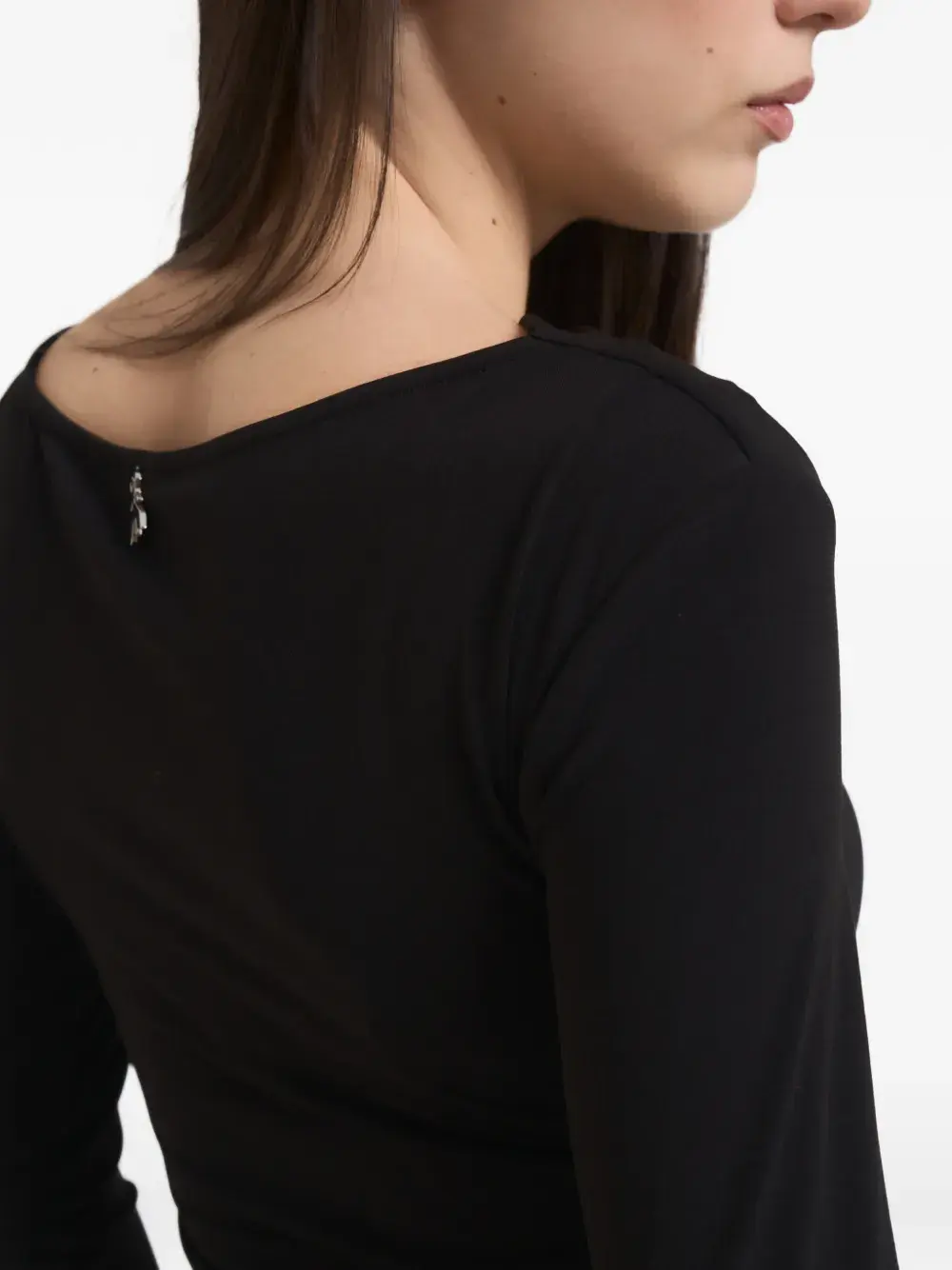 Черный топ с узлом, длинными рукавами, разрезами на подоле и вырезом лодочка