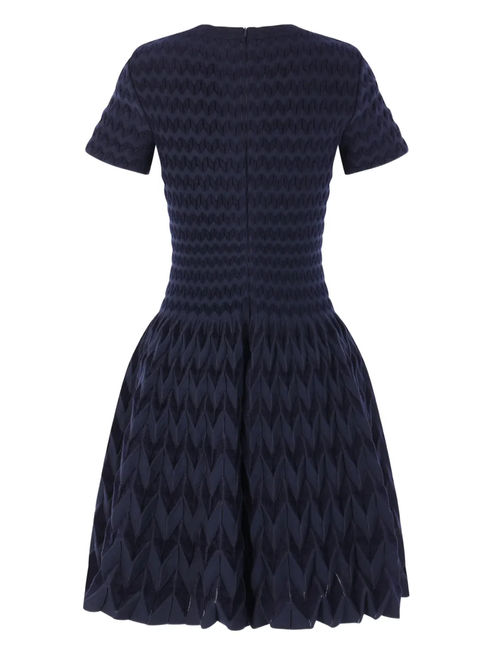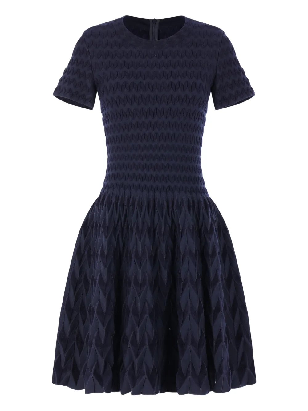 Синее платье с текстурированной отделкой, короткими рукавами, круглым вырезом, юбкой А-силуэта и застежкой-молнией