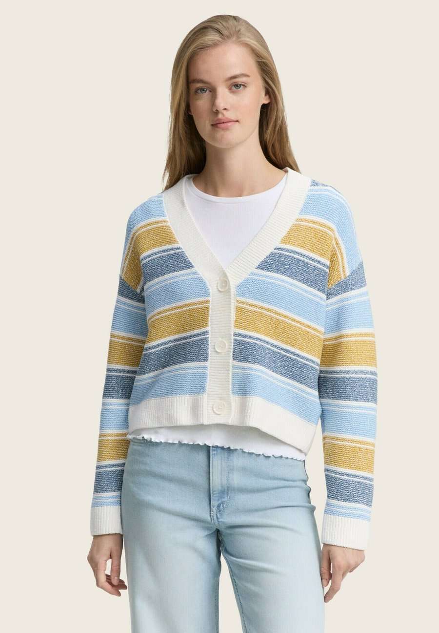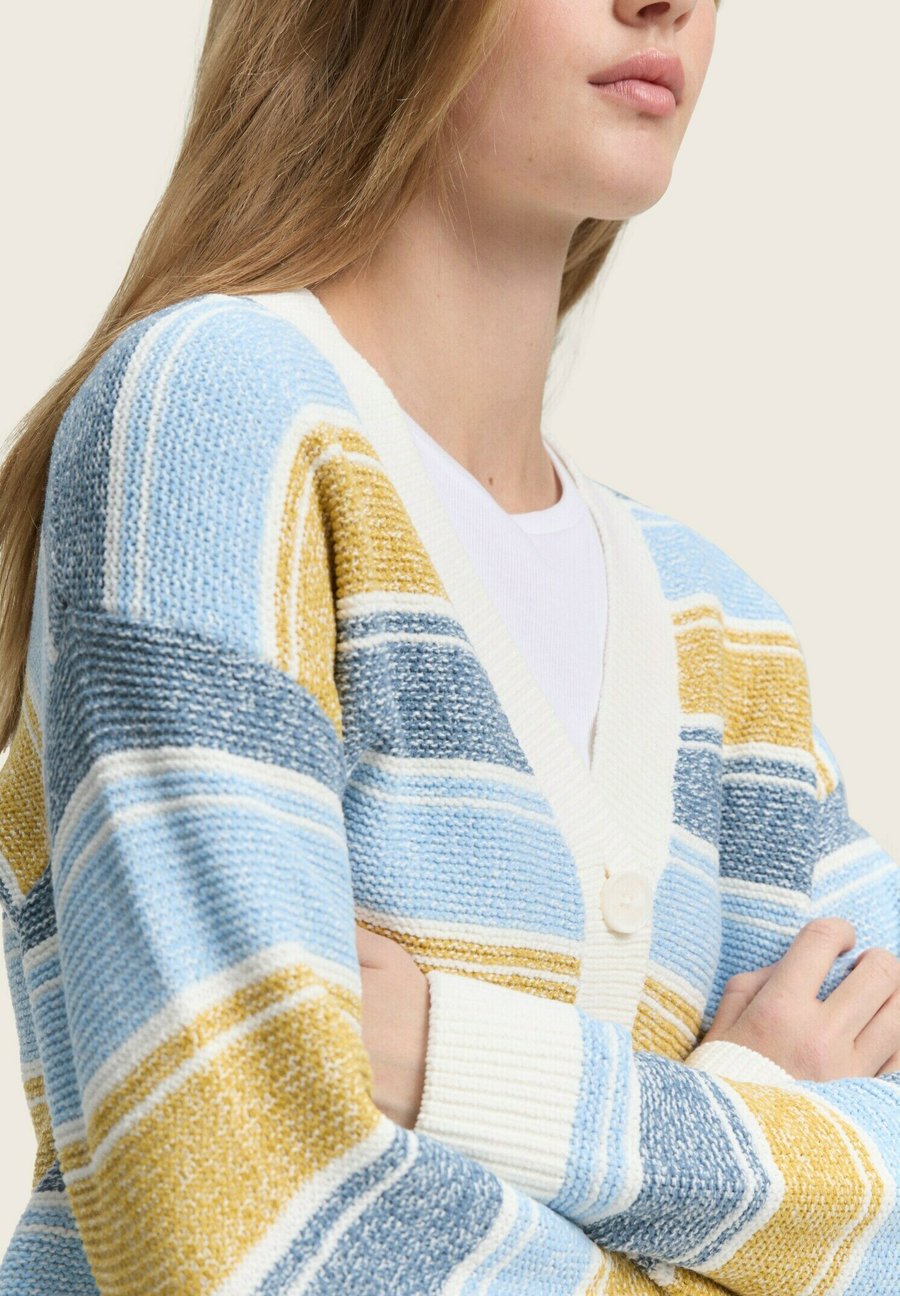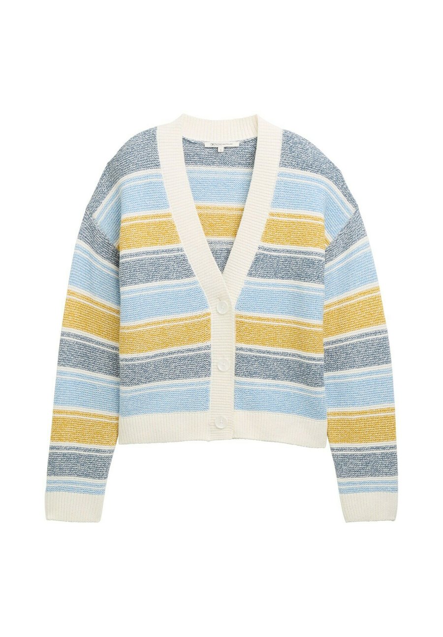 Кардиган в полоску с V-образным вырезом и приспущенным плечевым швом для свободного кроя. Вырез: Низкий V-образный вырез.Материал и уход