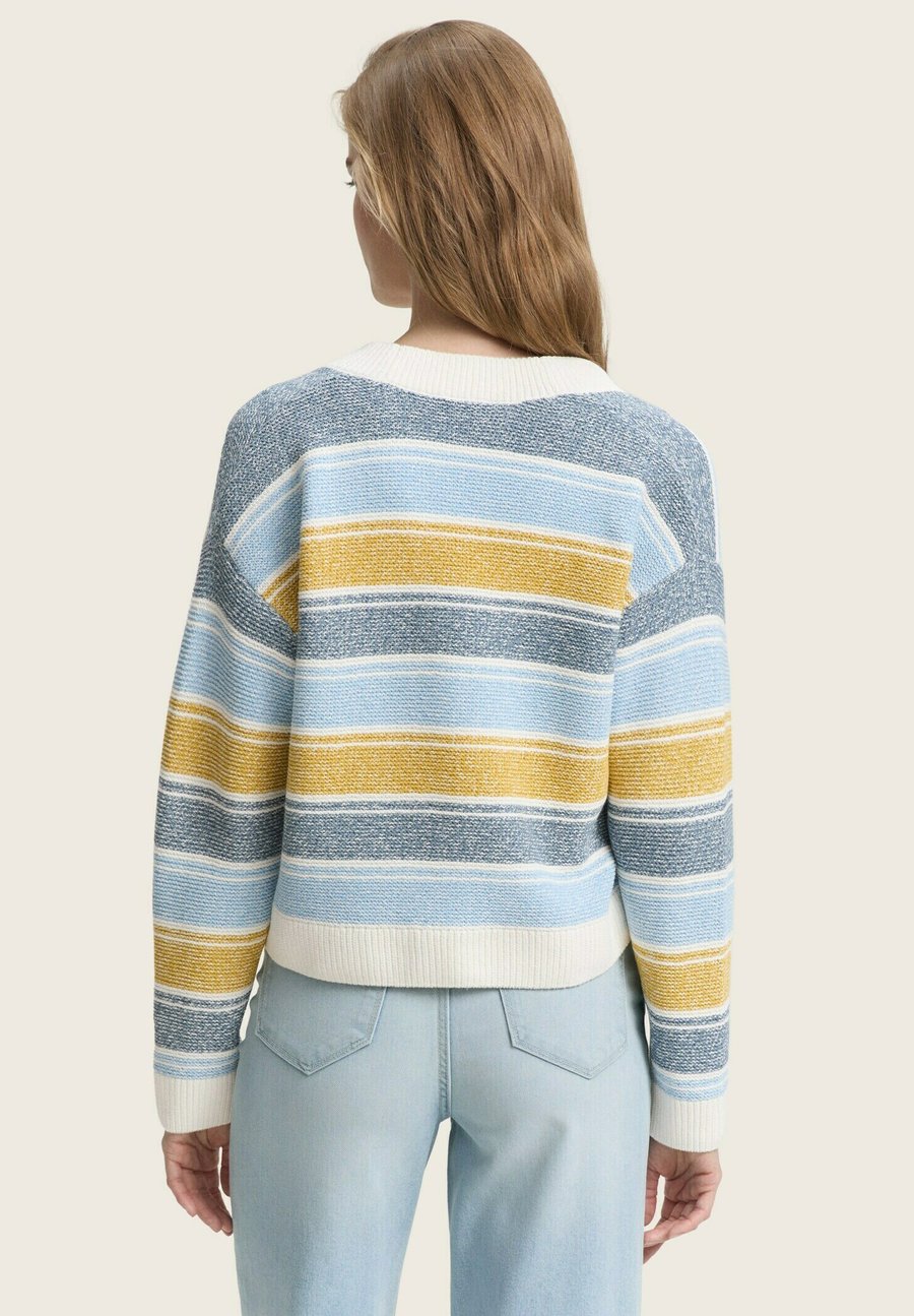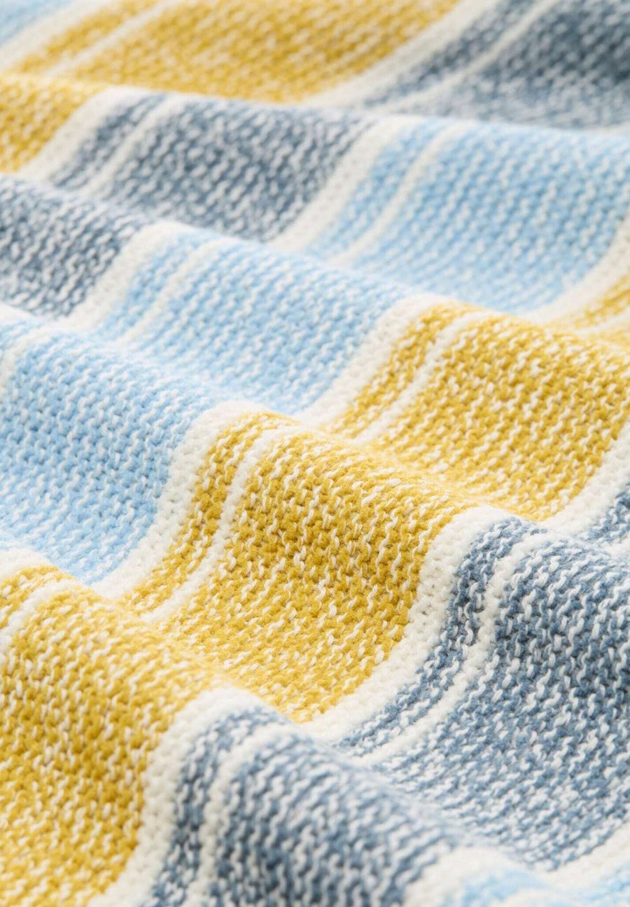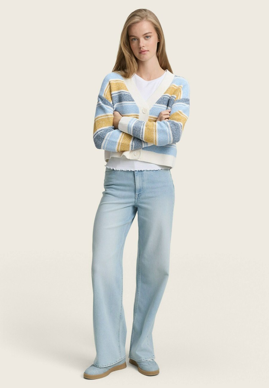Кардиган в полоску с V-образным вырезом и приспущенным плечевым швом для свободного кроя. Вырез: Низкий V-образный вырез.Материал и уход