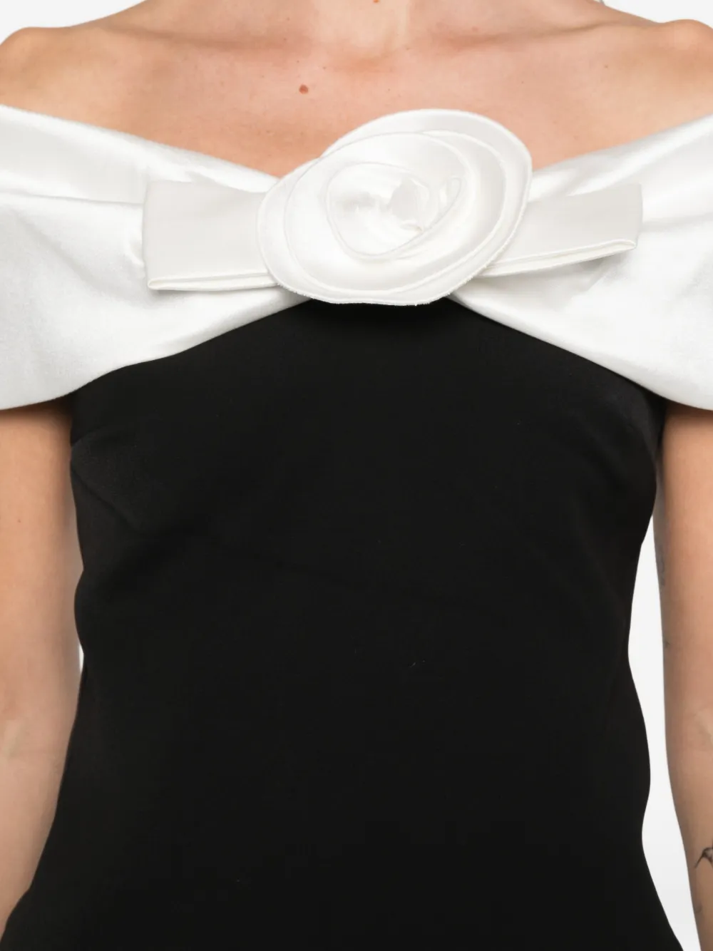Черный топ с открытыми плечами, цветочной аппликацией и прямым подолом