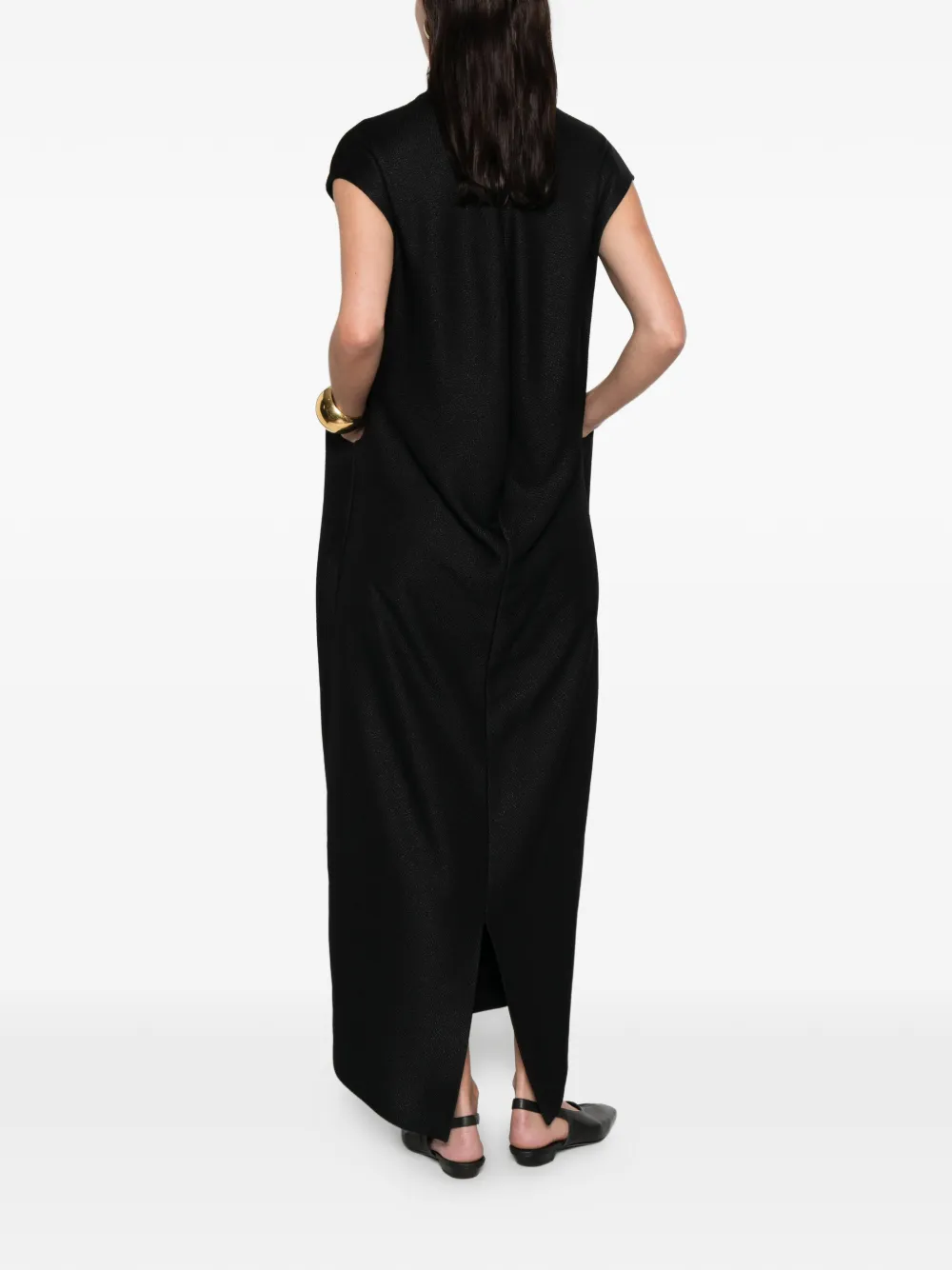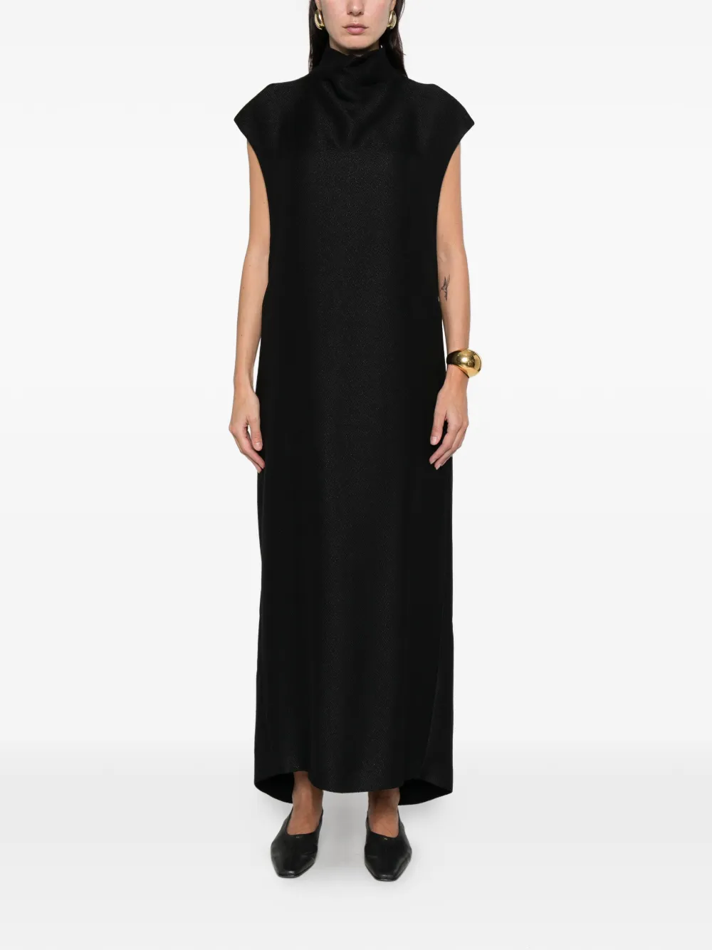 Черное платье макси длины без рукавов с воротником-стойкой и застежкой-молнией сзади