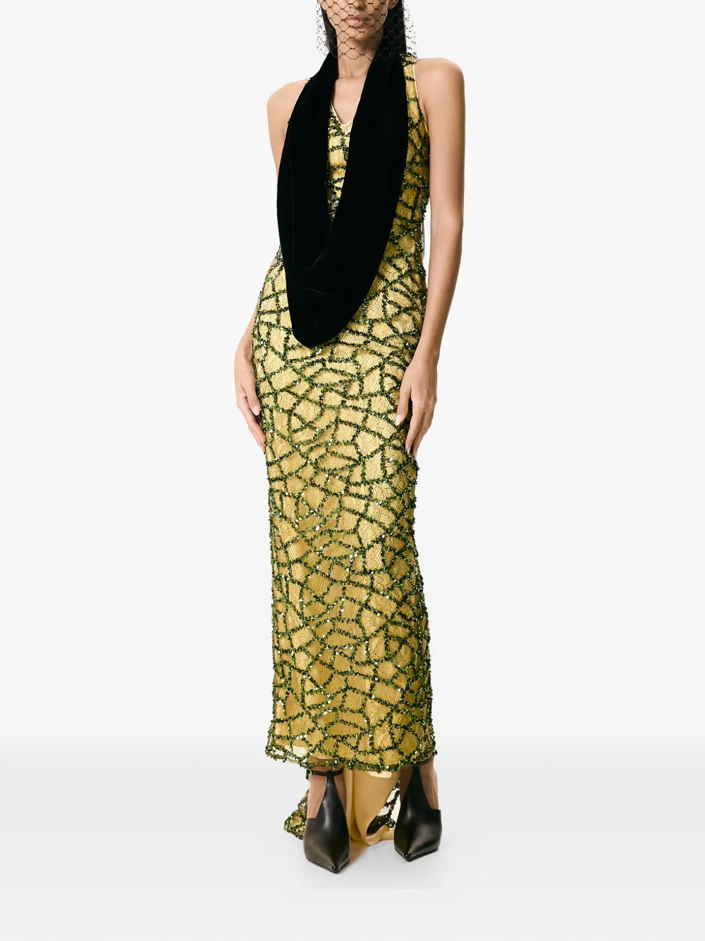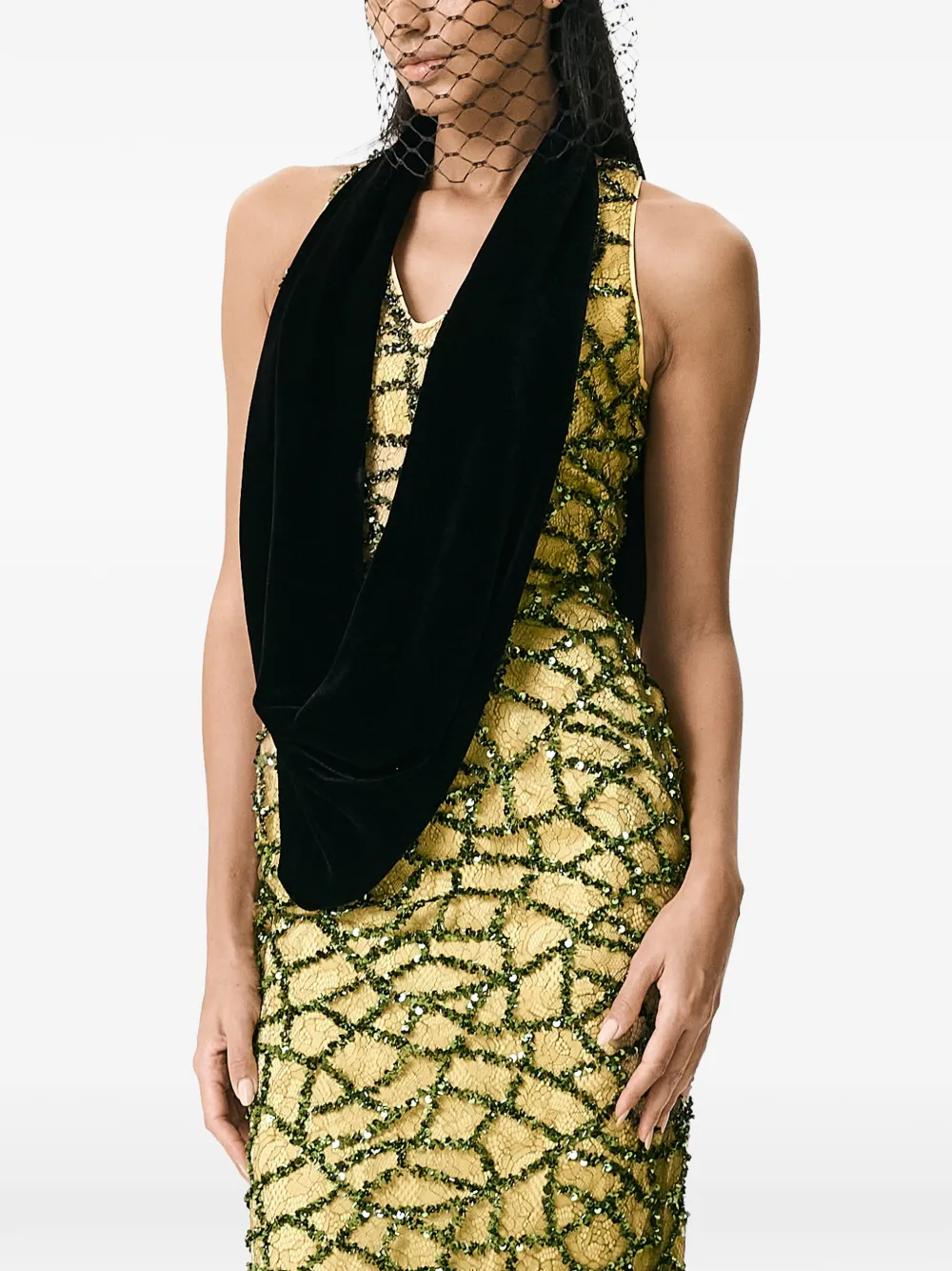 Зелёный шарф с отделкой, украшенный бисером, застёжка-молния сзади