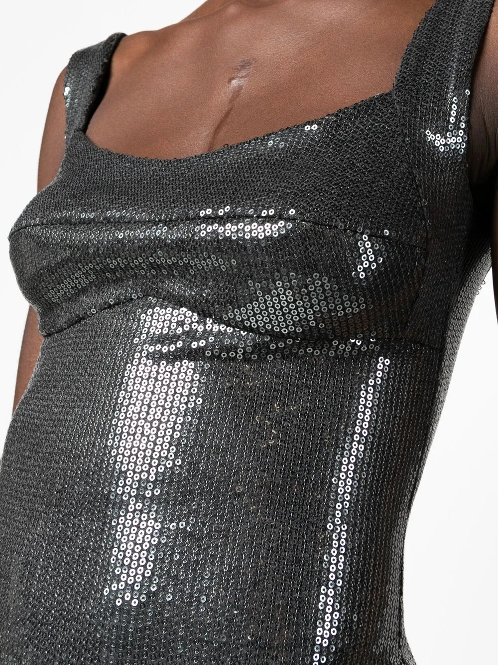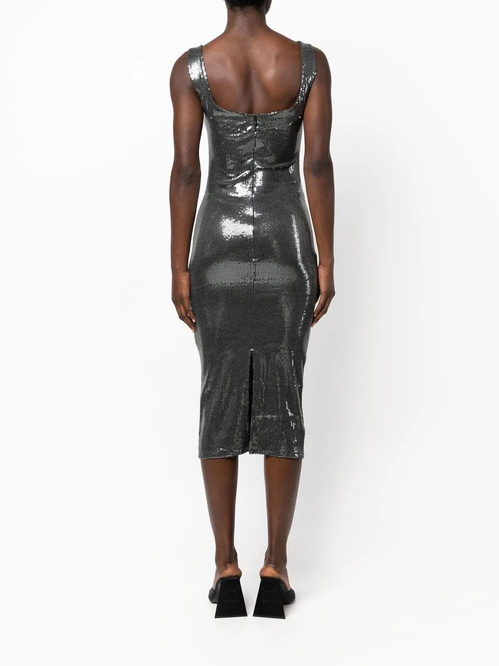 Антрацитово-серый, обтягивающий юбка, пайетки, U-образный вырез, U-образный вырез на спине, потайная застежка на молнии сзади, без рукавов, вырез сзади, прямой подол и длина миди.