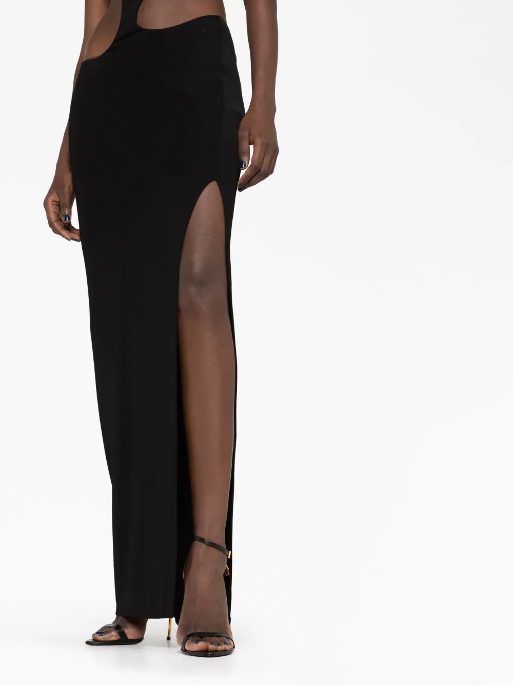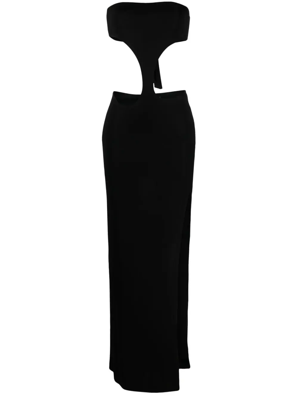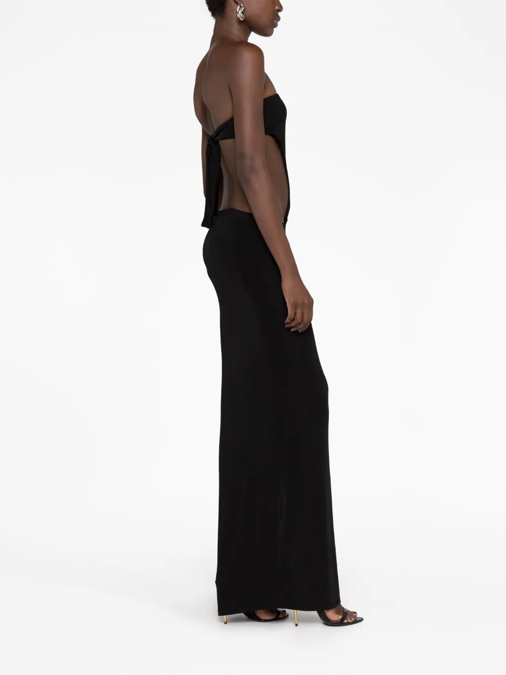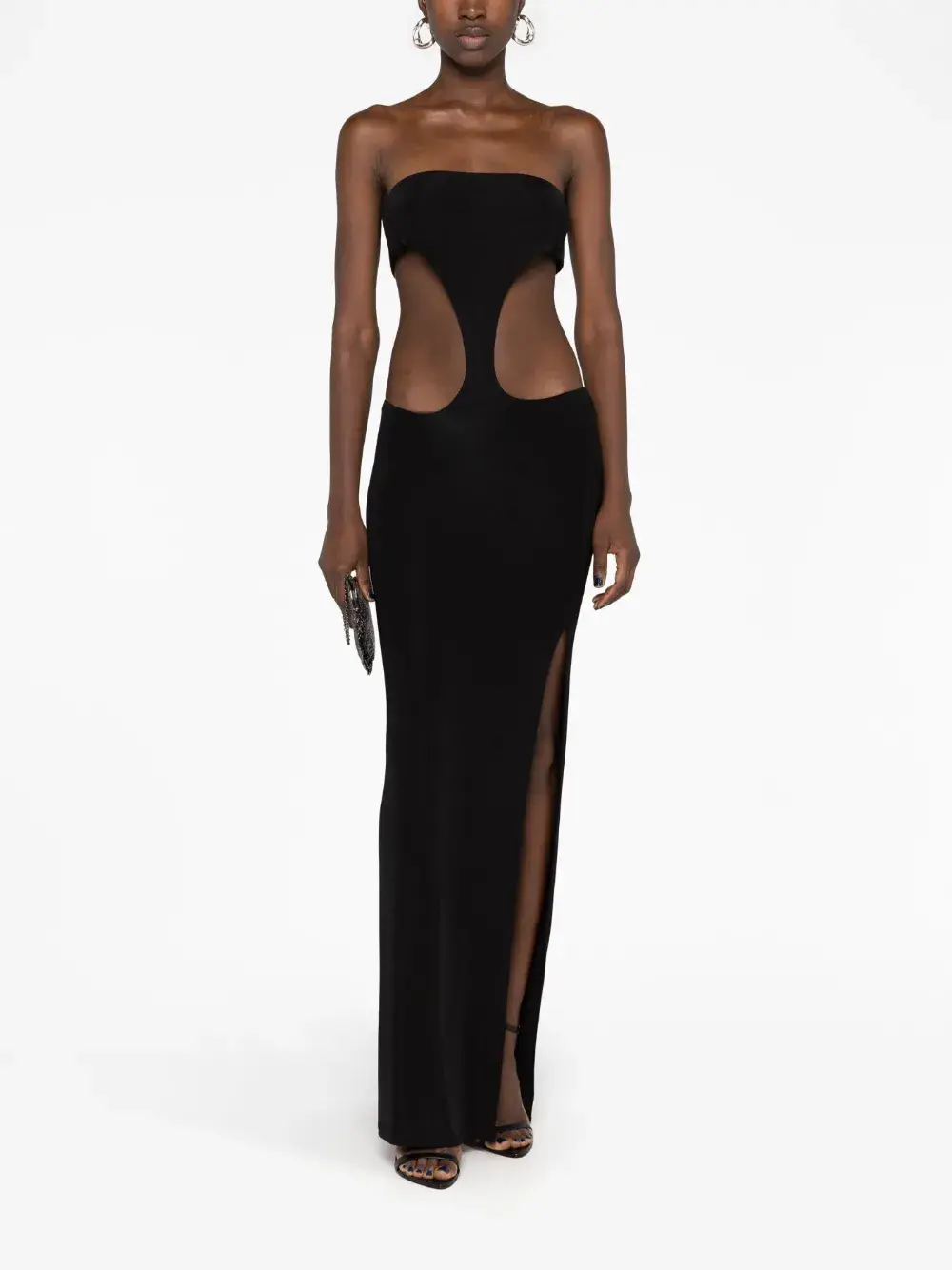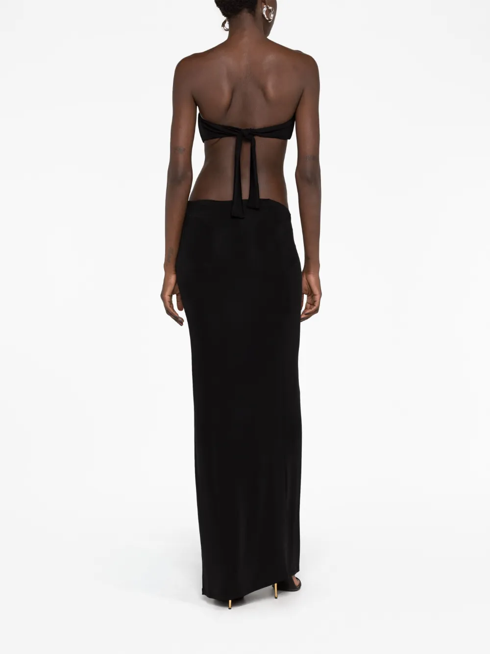 Черный, эластичный материал, без бретелей, квадратный вырез, вырезные детали, застежка на завязке сзади, боковой разрез и длина макси.