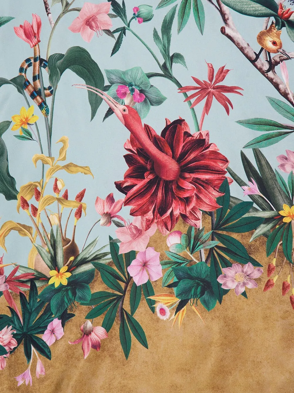 Светло-голубая блузка с цветочным принтом, длинными рукавами, высоким воротом и завязками
