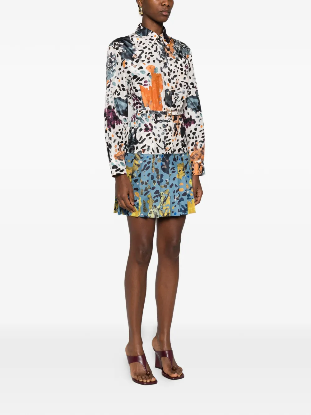 Белый и разноцветный абстрактный узор, классический воротник, пояс, застежка-молния спереди, плиссированный дизайн, длинные рукава