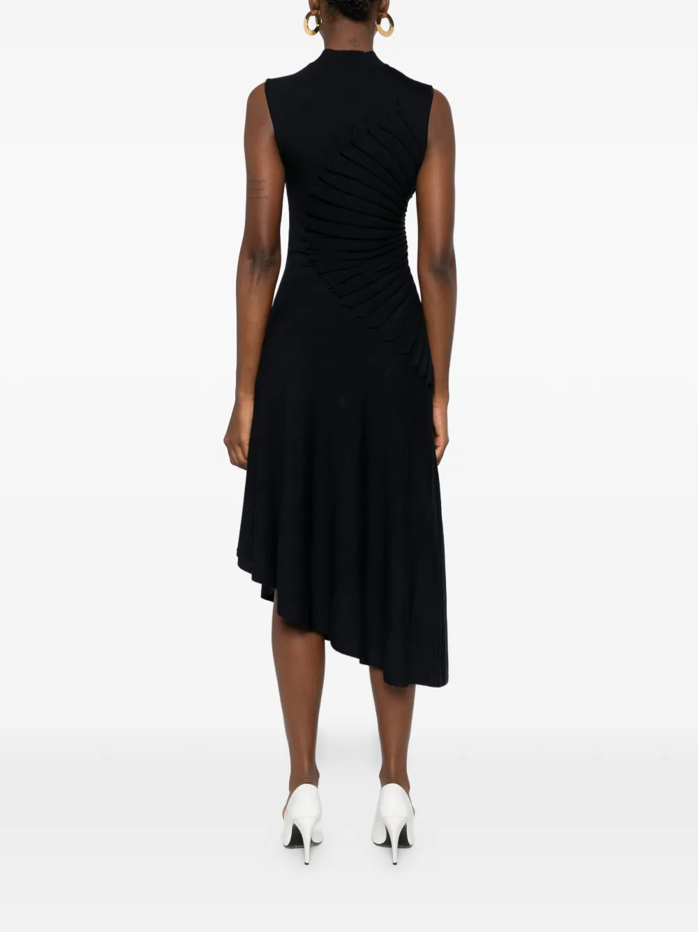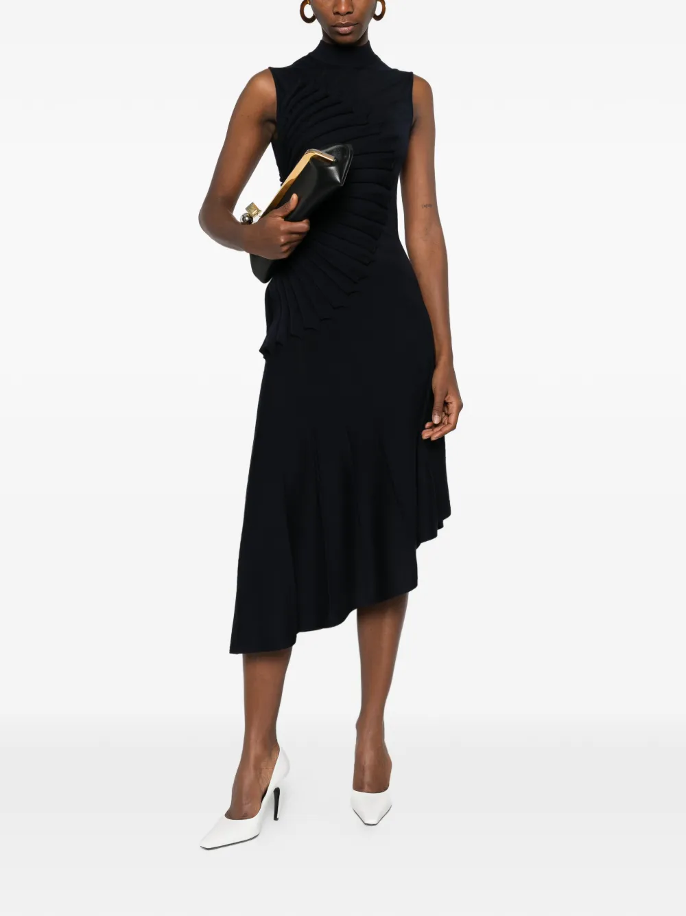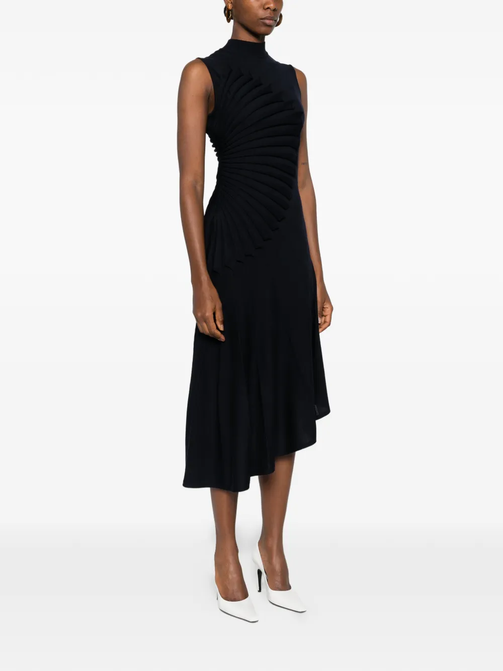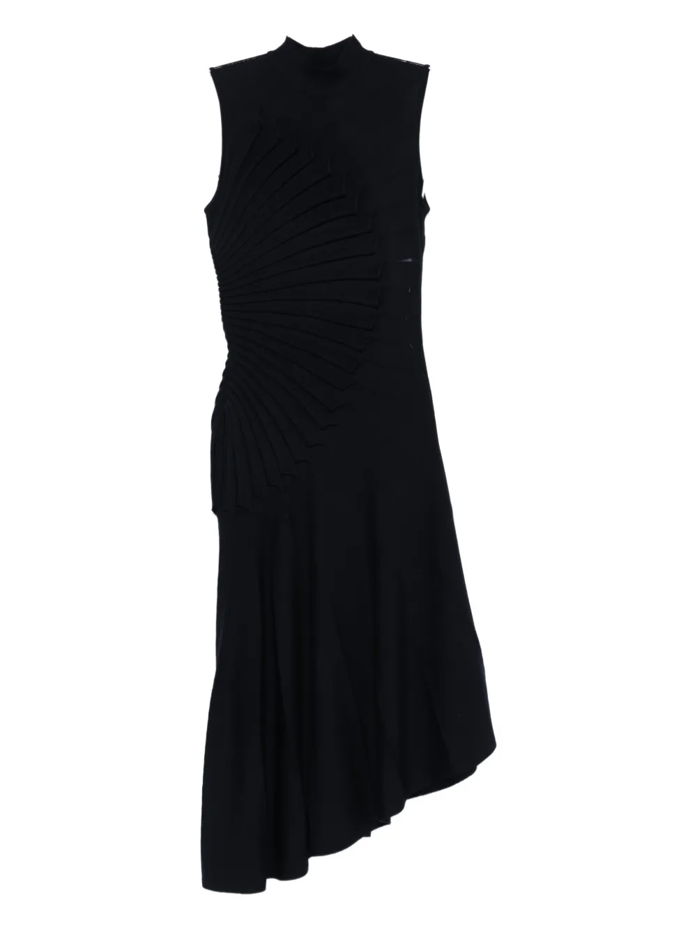 Темно-синее платье без рукавов с воротником-стойкой, плиссированной отделкой, асимметричным подолом и расклешенной юбкой