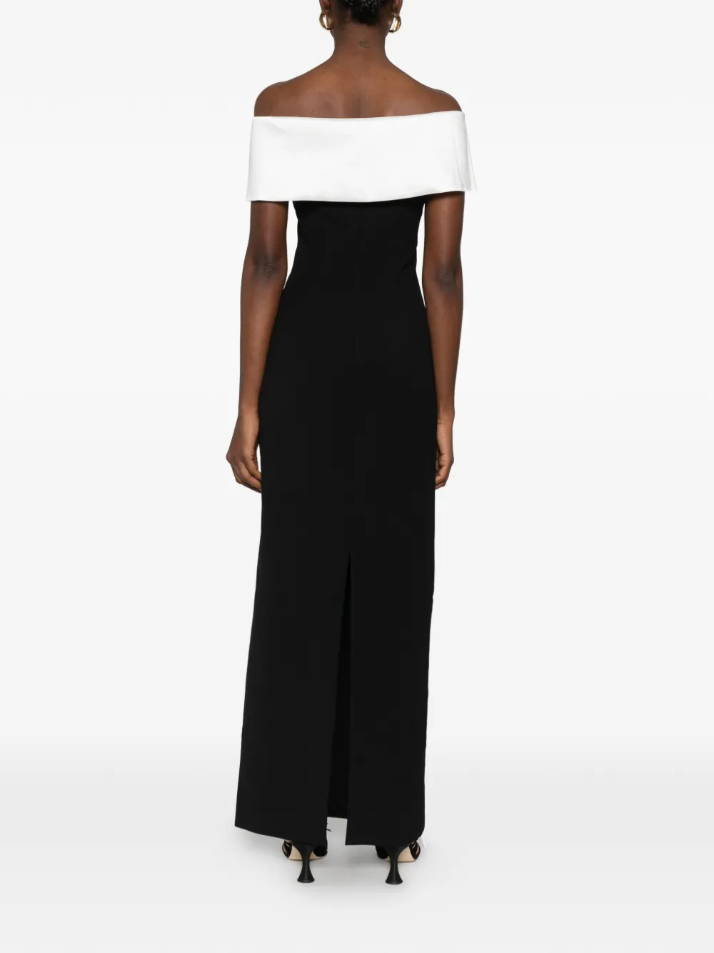 Чёрно-белое платье макси из крепа с открытыми плечами и цветочным декором