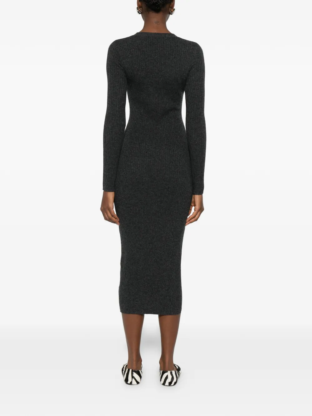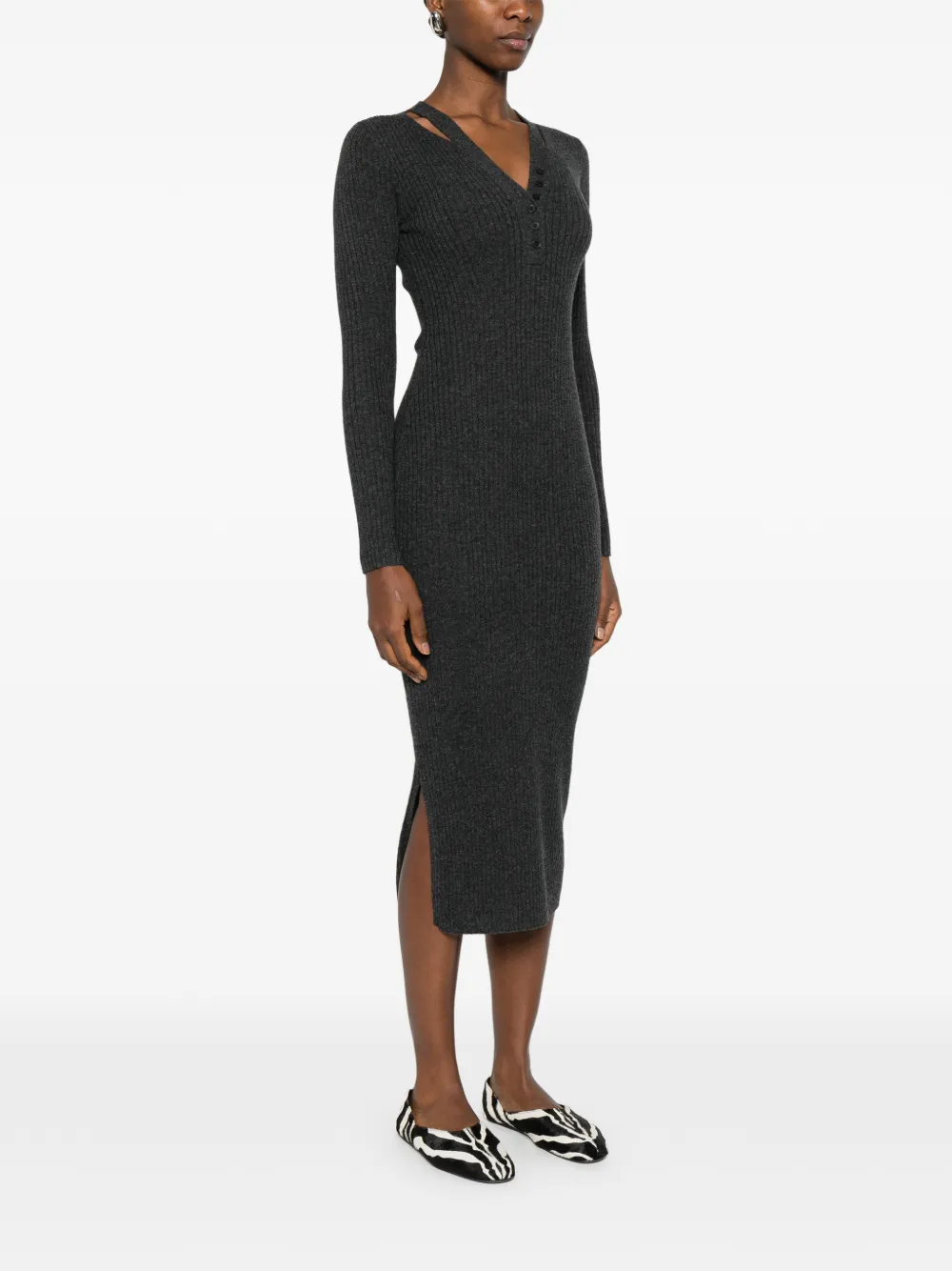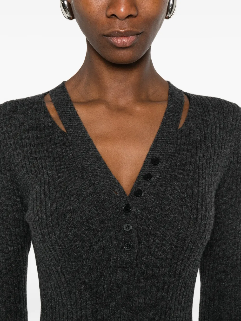 Графитовый пуловер с V-образным вырезом, рубчатой вязкой, застежкой на пуговицы, длинными рукавами и длиной миди
