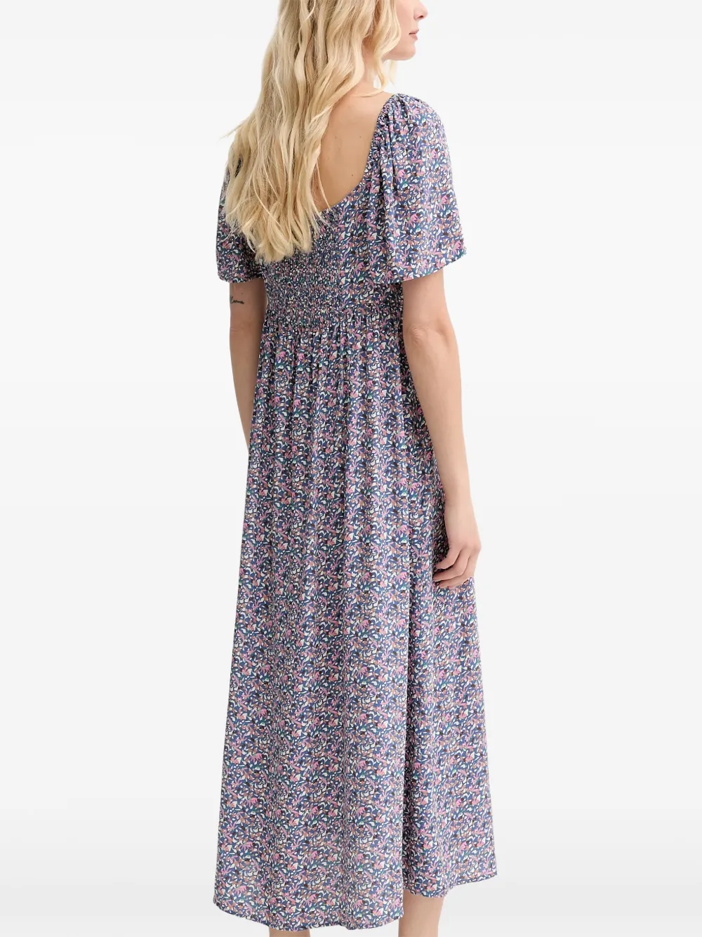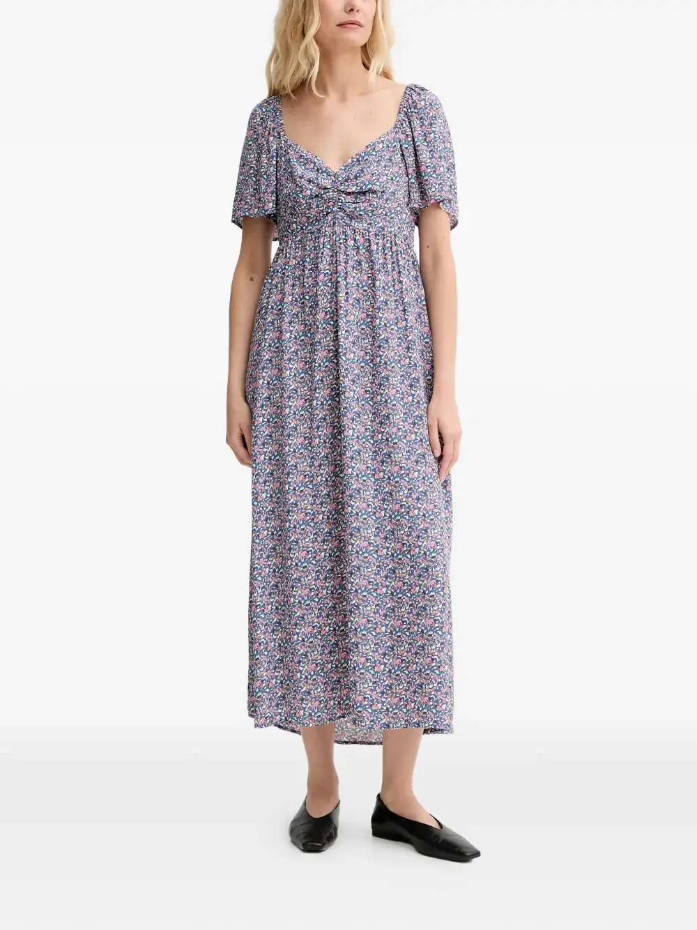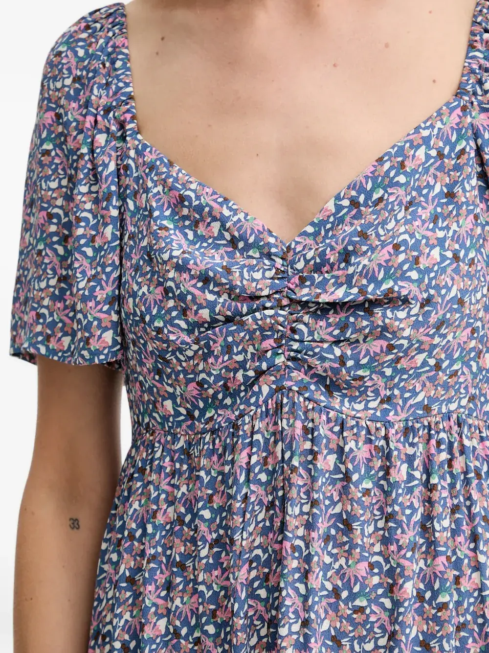 Синее платье с цветочным принтом, присборенными деталями, короткими рукавами и эластичным поясом