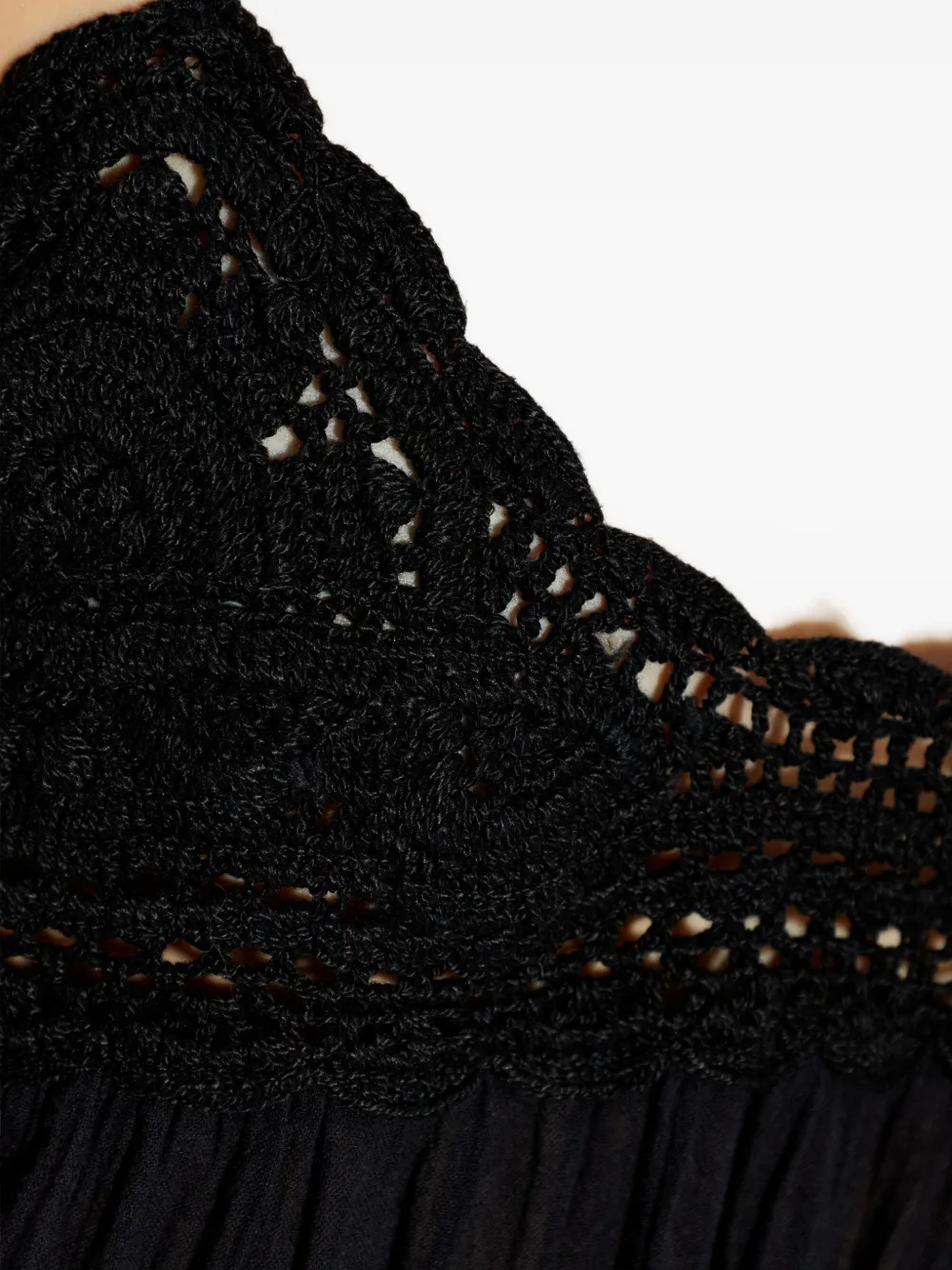 Чёрный топ без рукавов с вязаными крючком деталями, бахромой и волнистой отделкой