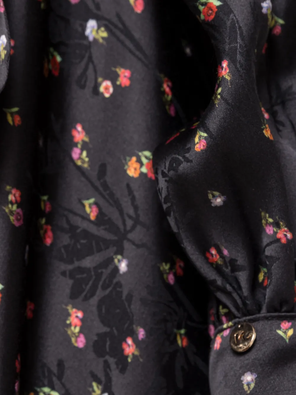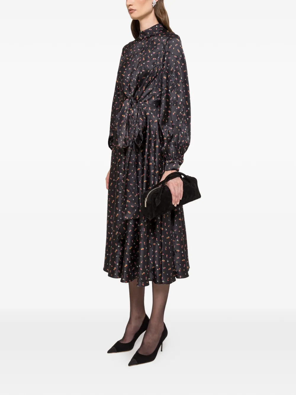 Черное платье миди с цветочным принтом, завязками, длинными рукавами и манжетами на пуговицах