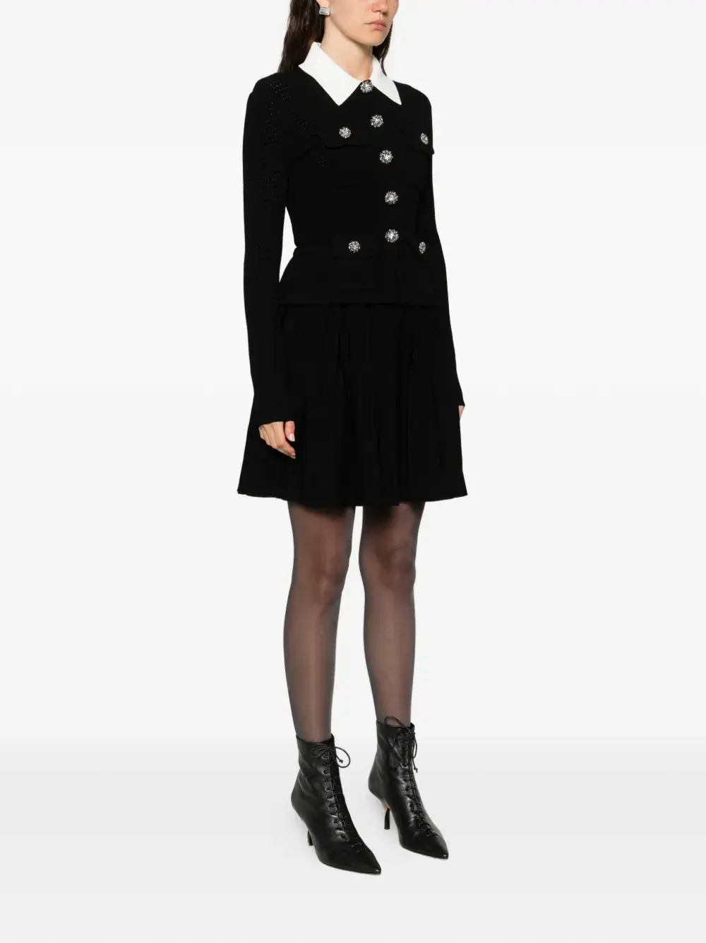 Черное платье с белым воротником, украшенными пуговицами, плиссированной юбкой, накладными карманами спереди и длинными рукавами