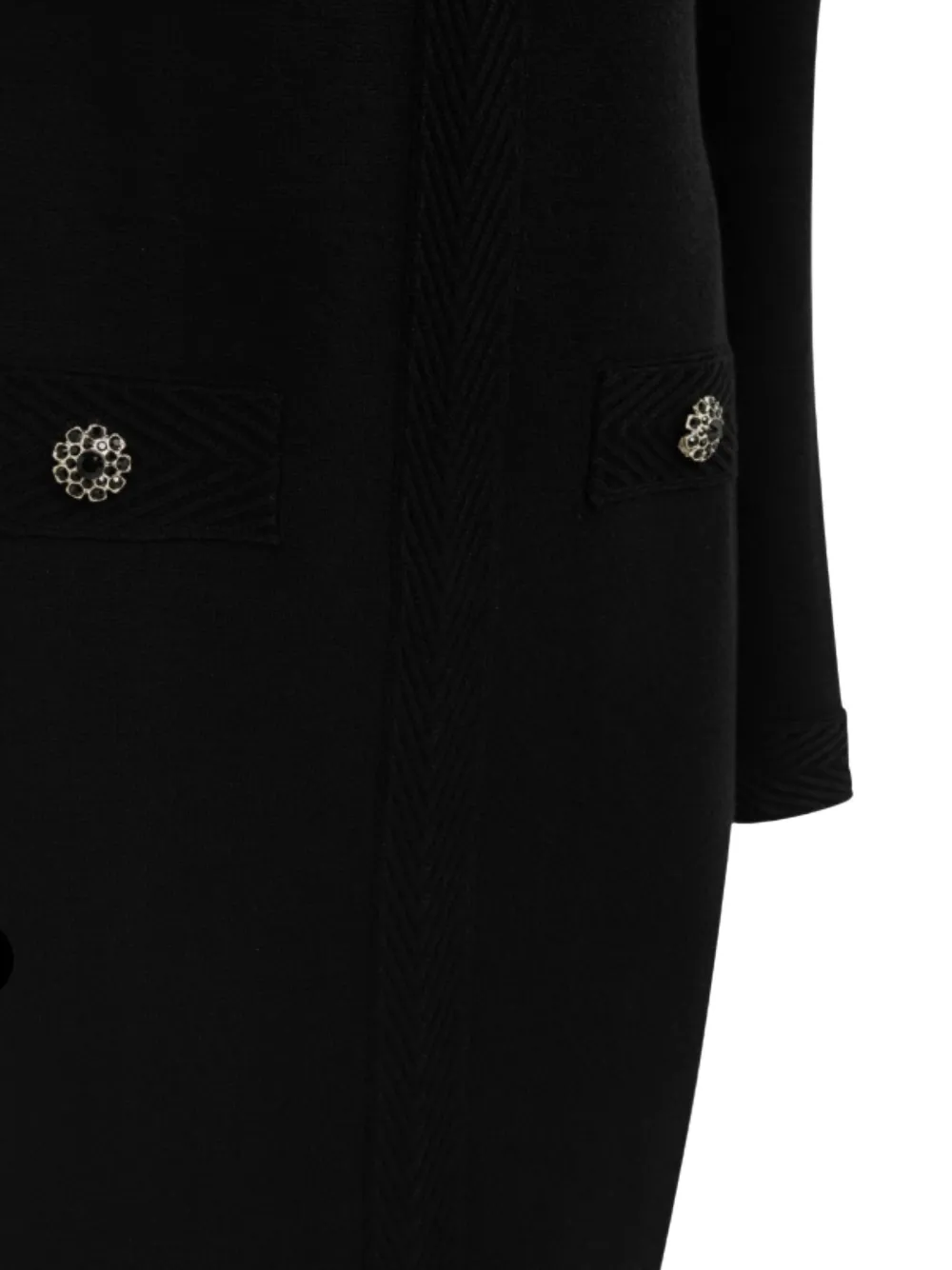 Чёрная вязаная конструкция, украшение пуговицами, длинные рукава, квадратный вырез, два кармана
