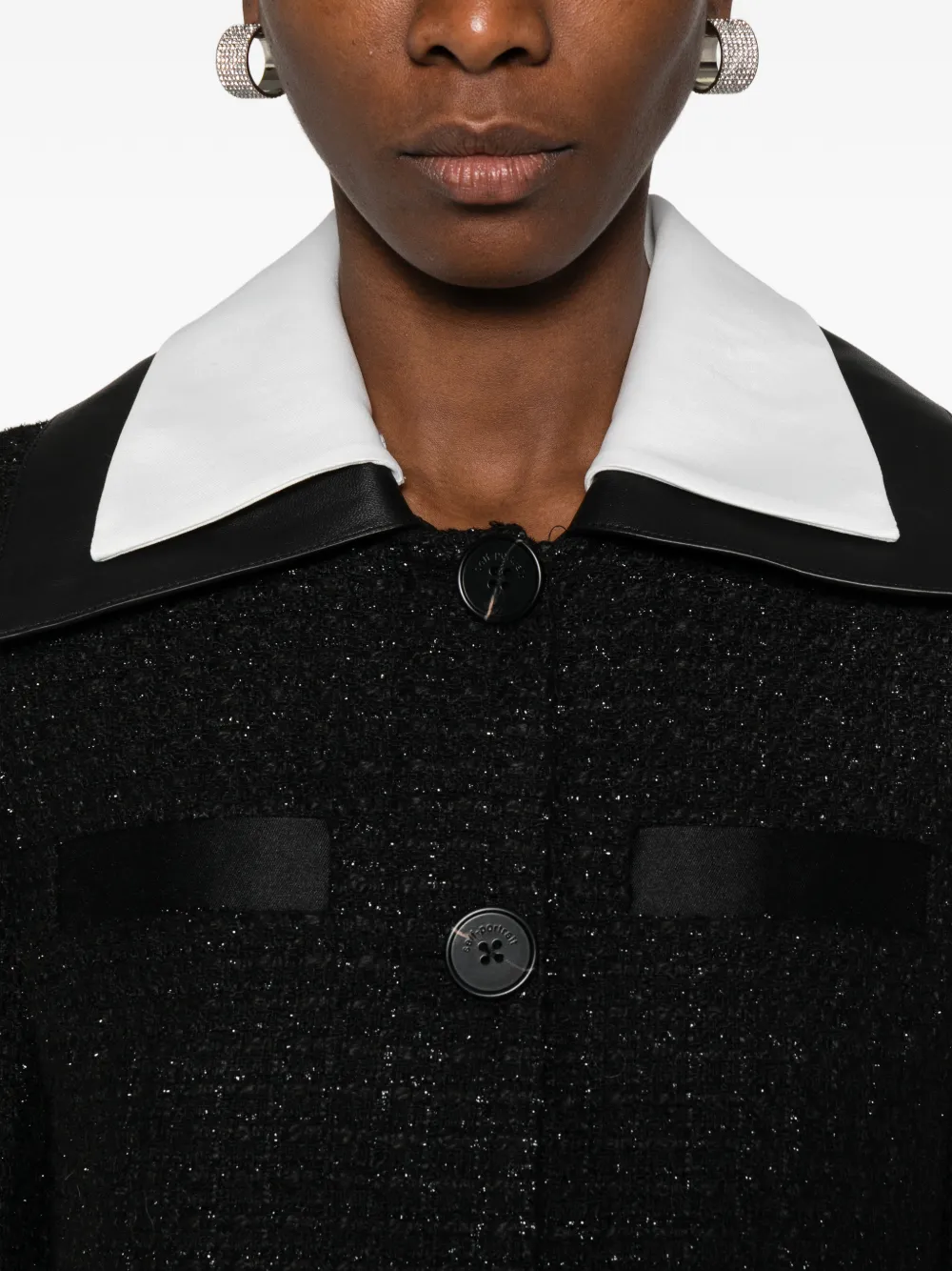 Чёрный, контрастный воротник, застёжка на пуговицы, передние карманы, длинные рукава
