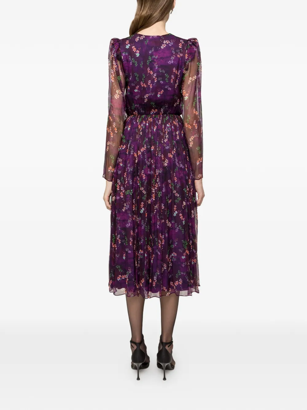 Платье фиолетового цвета с цветочным принтом, аппликацией в виде цветов, V-образным вырезом, длинными рукавами и плиссированной юбкой
