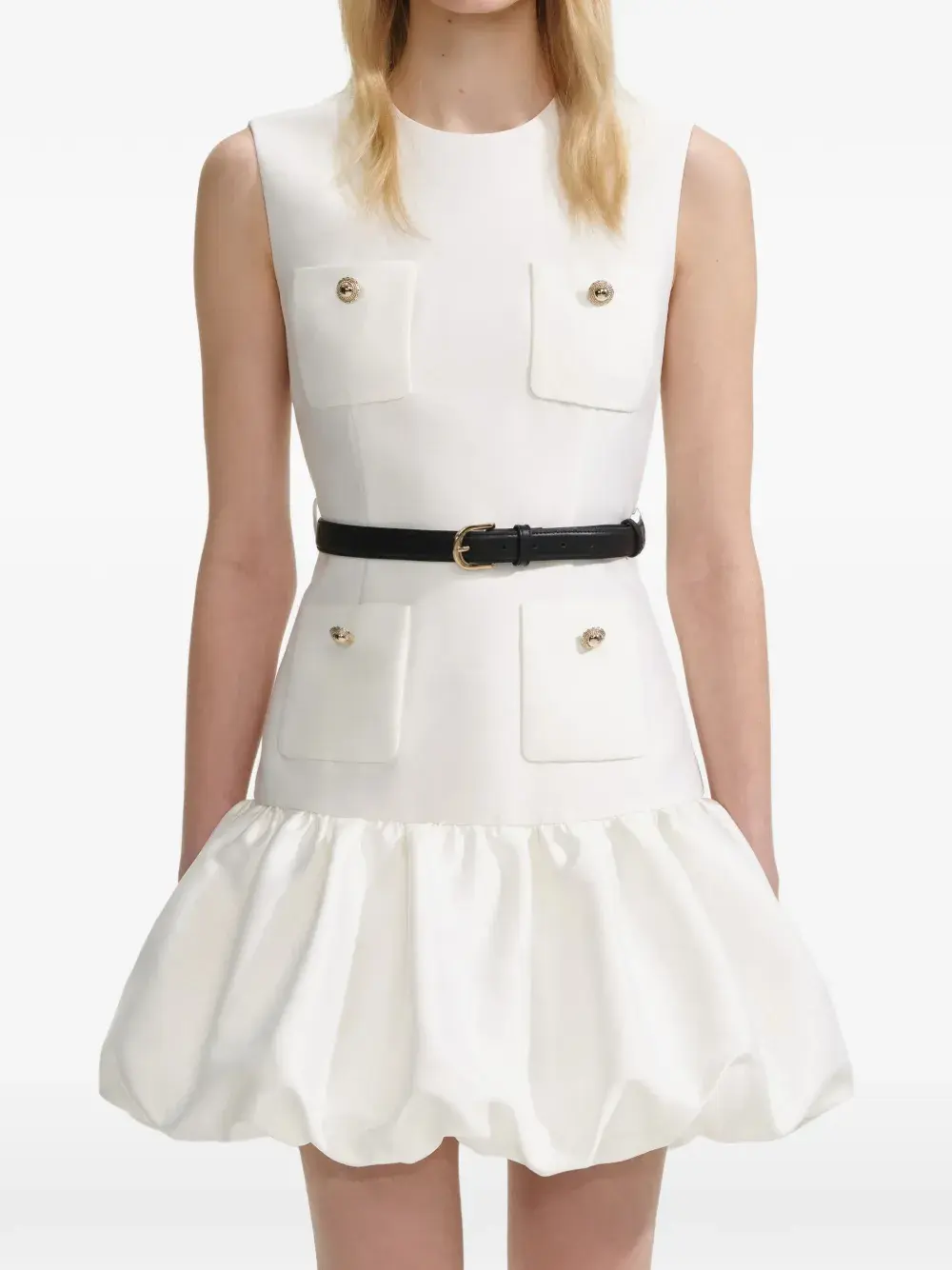 Белое платье без рукавов с круглым вырезом, поясом, карманами и оборчатым низом
