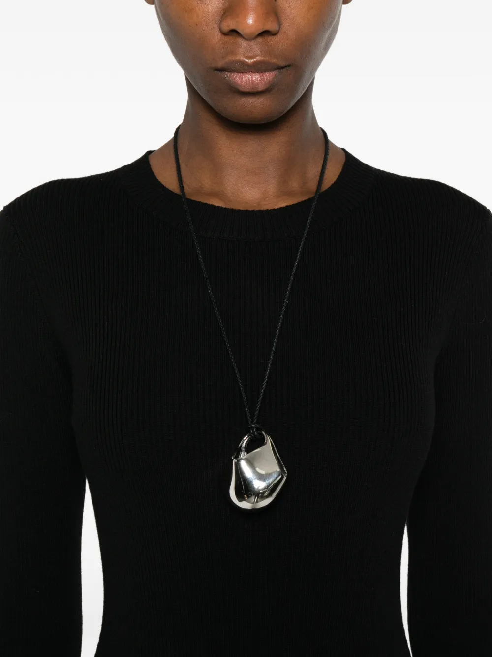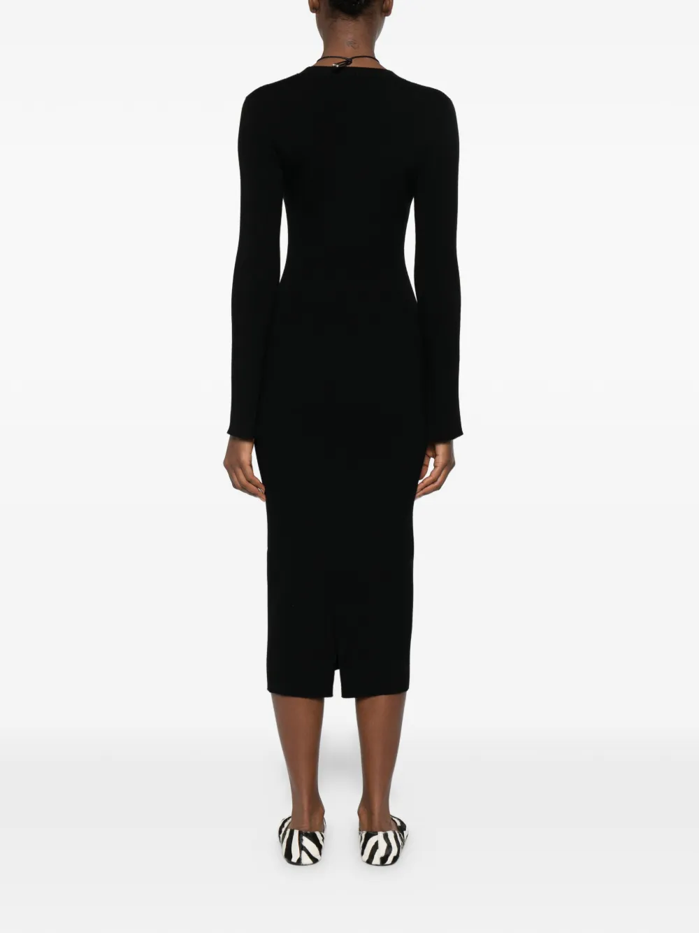 Чёрное платье с круглым вырезом, длинными рукавами, приталенным силуэтом и длиной миди