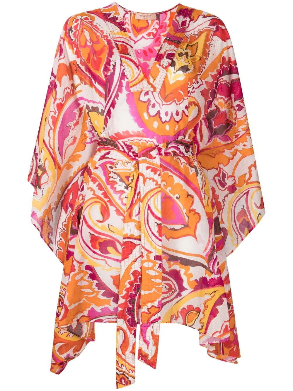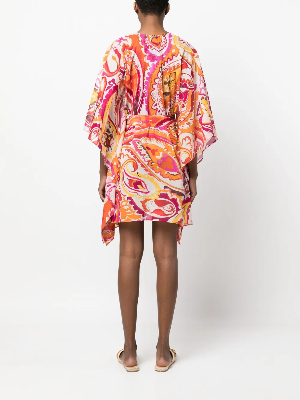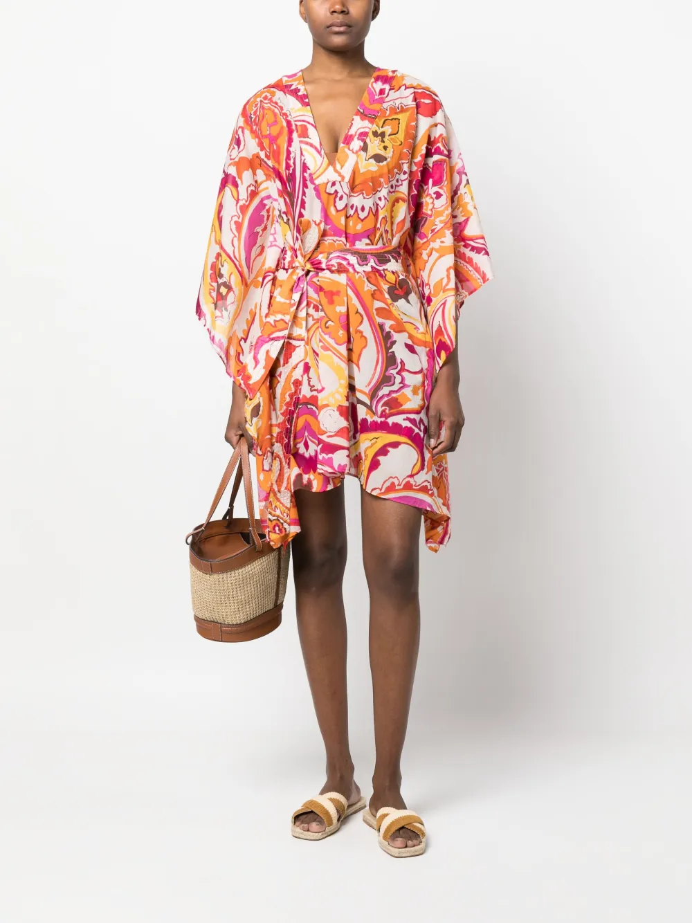 Сплошной цветочный принт, V-образный вырез, ремень на талии, короткие рукава с драпировкой и асимметричный подол.