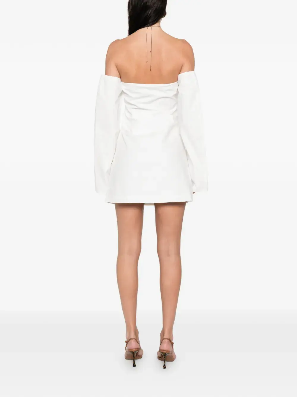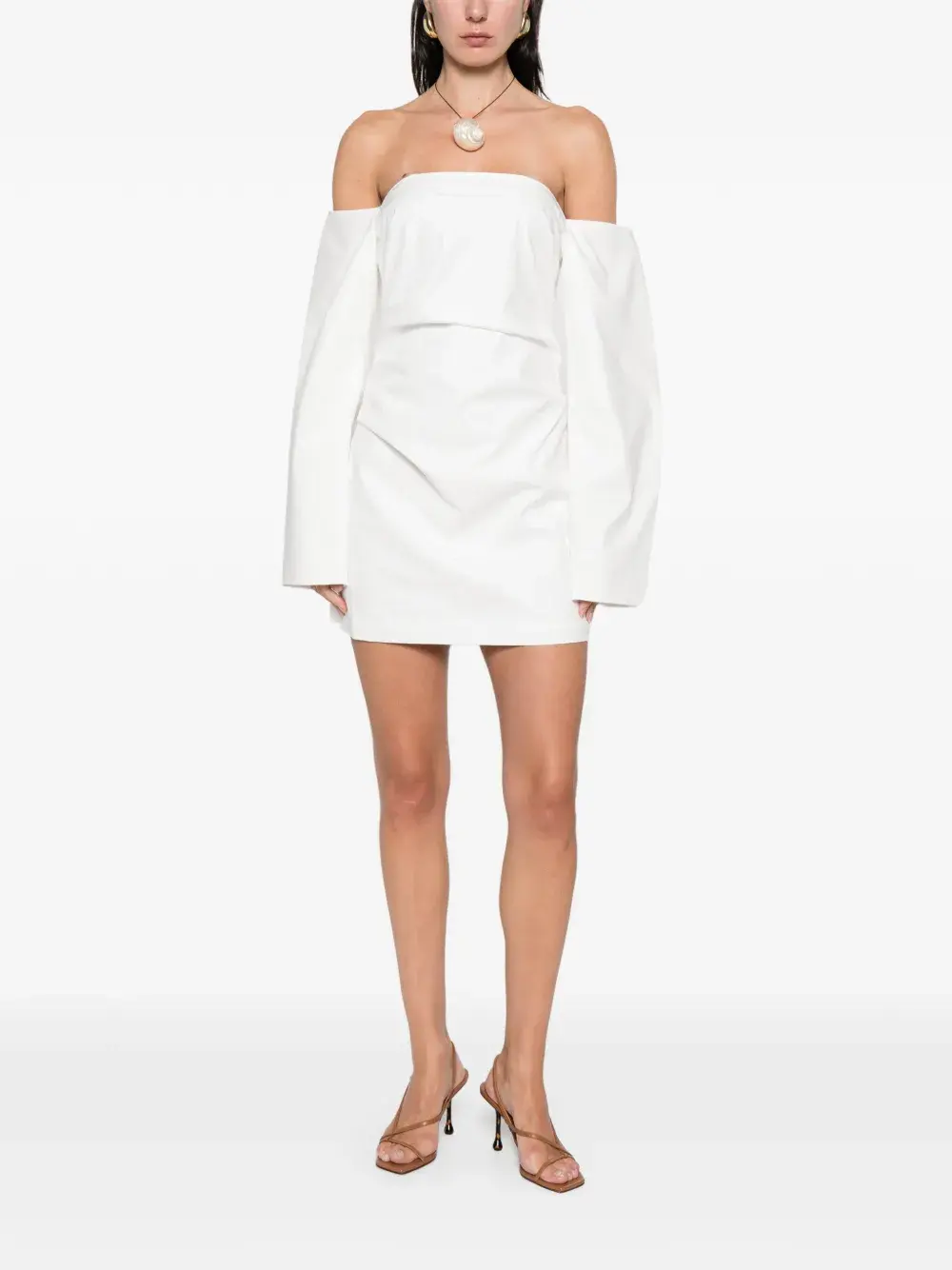 Белое платье с открытыми плечами, длинными рукавами и длиной до бедра