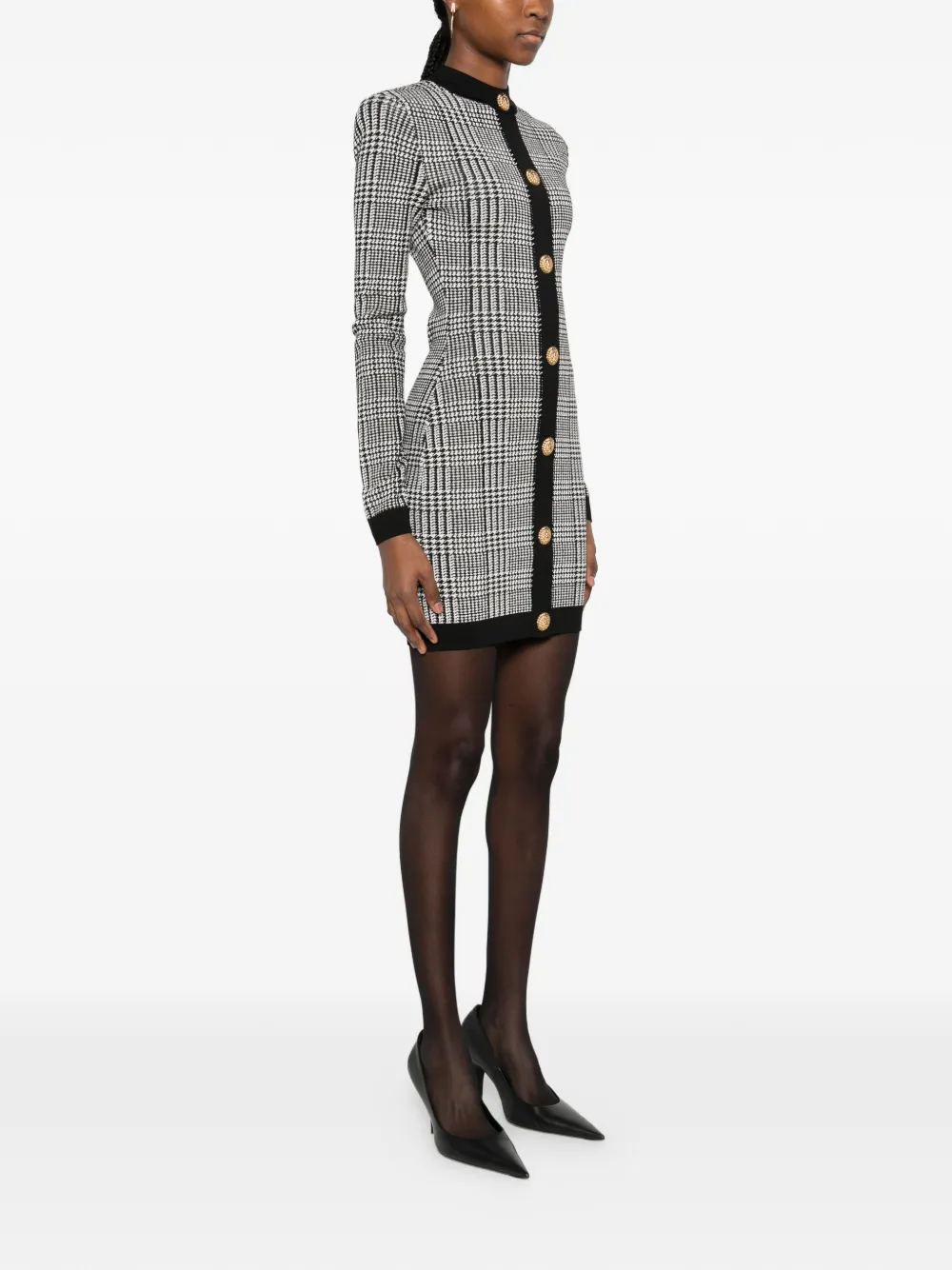 Черно-белый принт в клетку "принц уэльский", украшение в виде пуговиц золотистого оттенка, длинные рукава, высокий ворот, эластичные манжеты