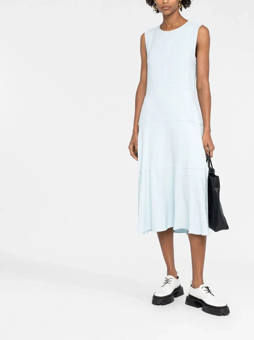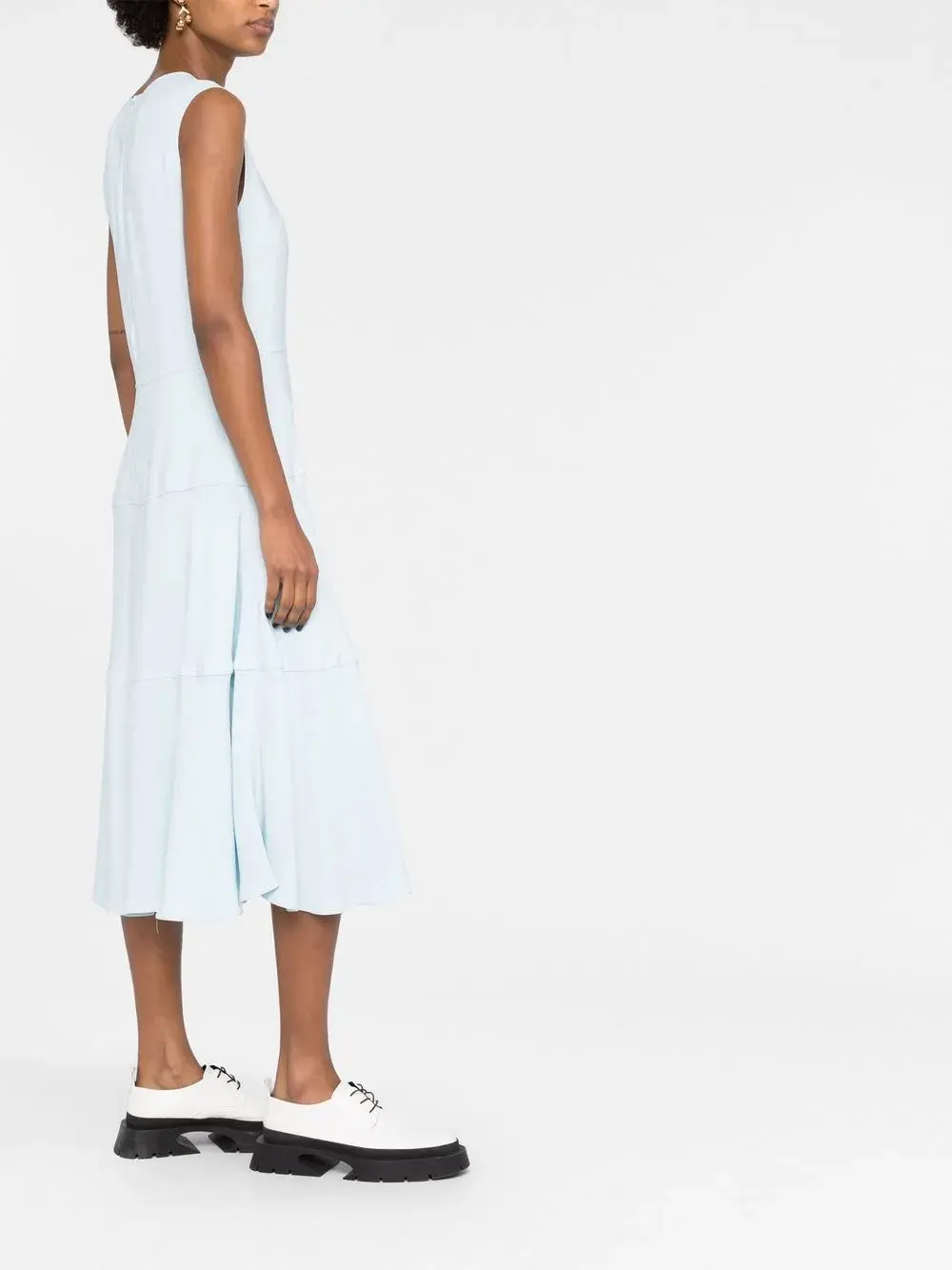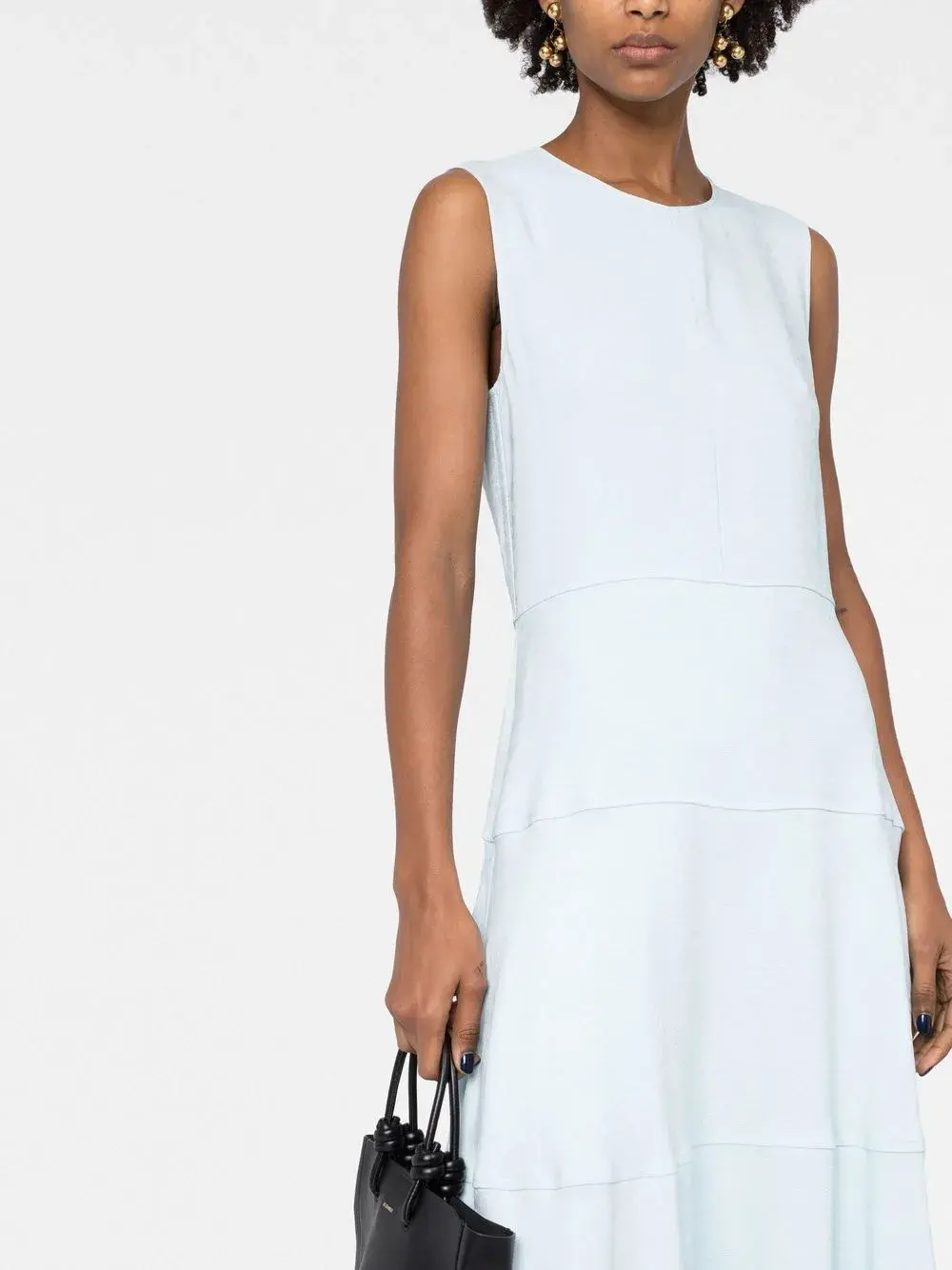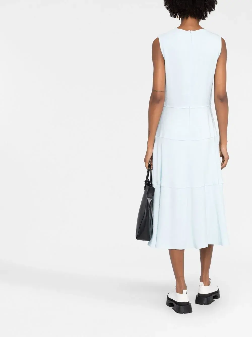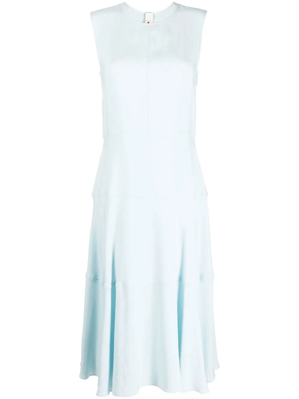 Голубой, жаккардовая модель, складки, круглый вырез, без рукавов и потайная застежка на молнии сзади.
