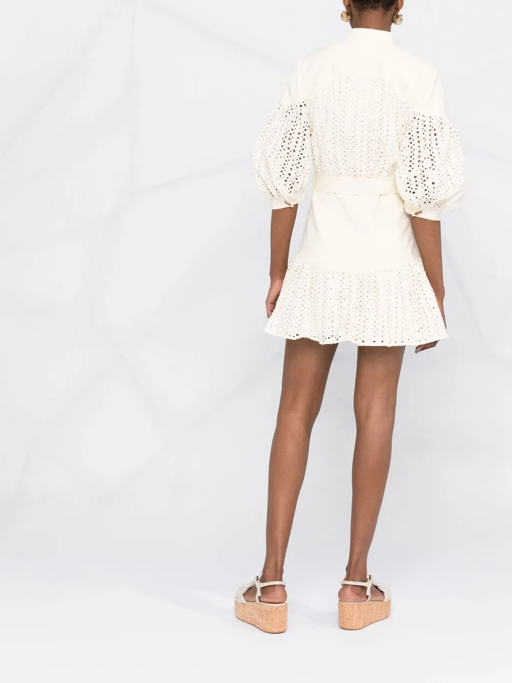 Английская вышивка, короткие объемные рукава, воротник-стойка, застежка на пуговицах спереди, ремень на талии, строчка в тон, закругленный подол и длина выше колена.