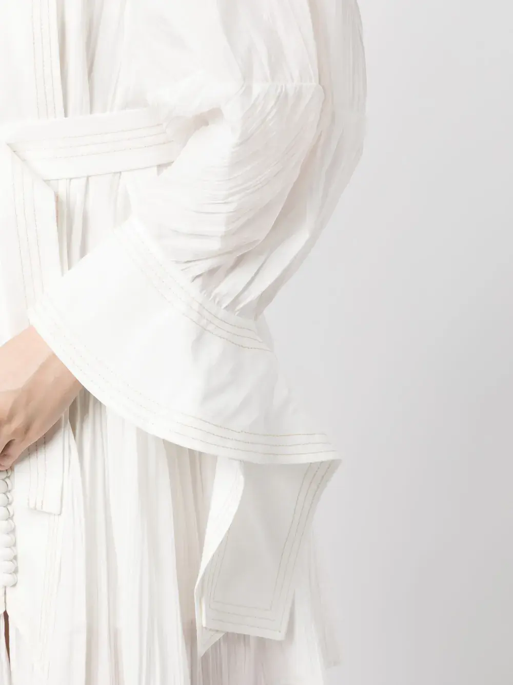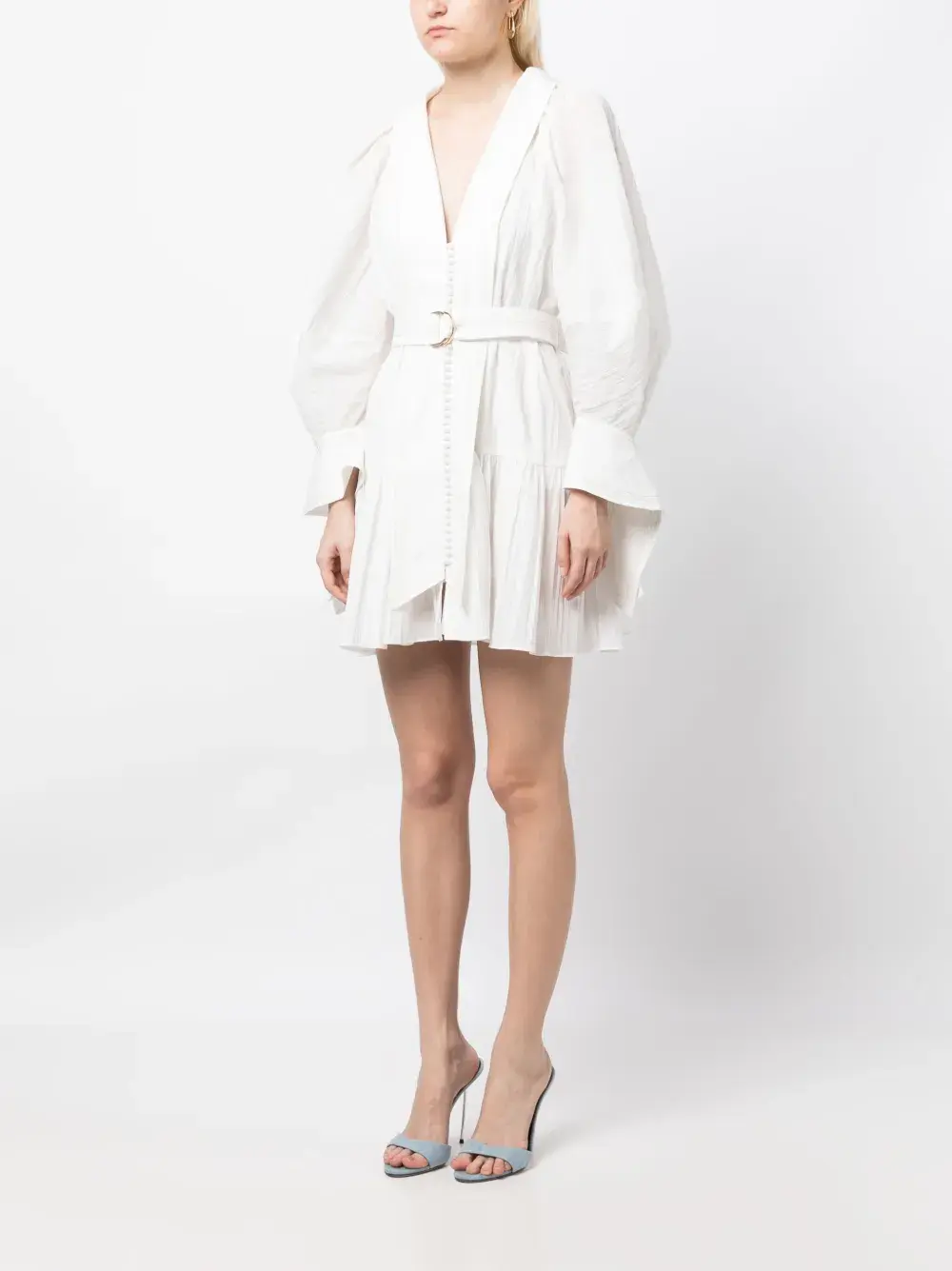 Цвет слоновой кости, ремень на талии, глубокий V-образный вырез, застежка на пуговицах спереди, складки, ярусная юбка, объемные рукава, закругленный подол и длина до бедер.