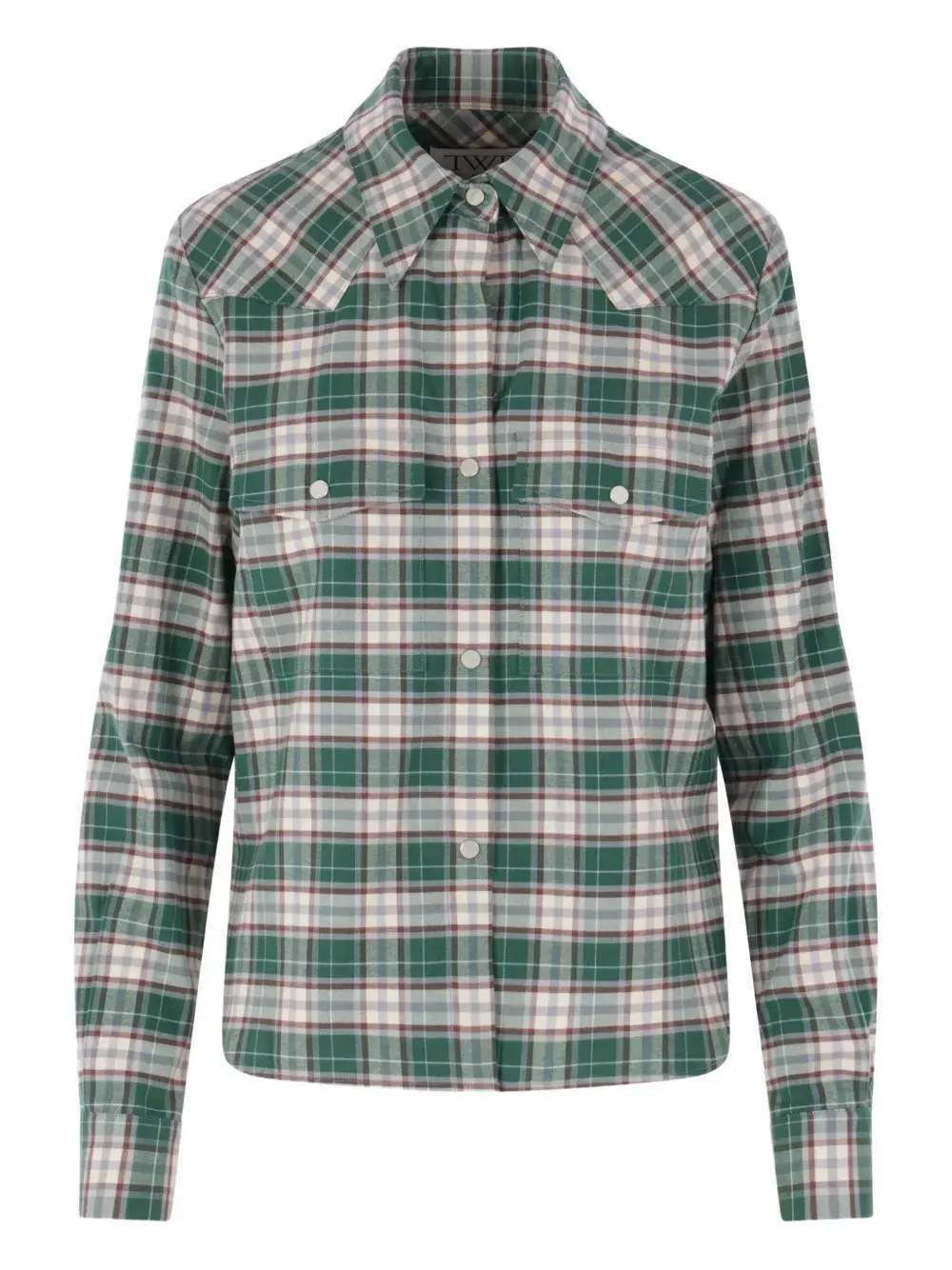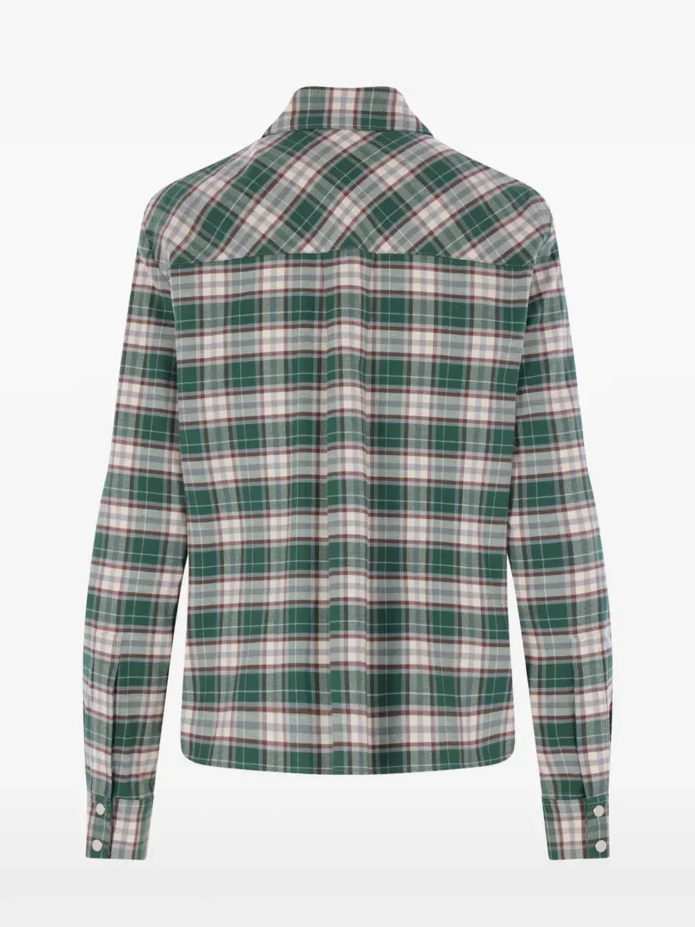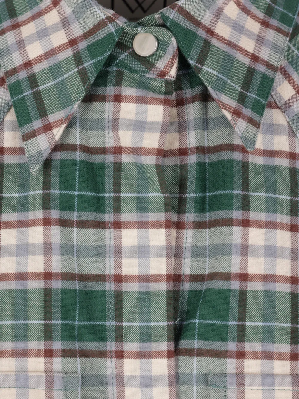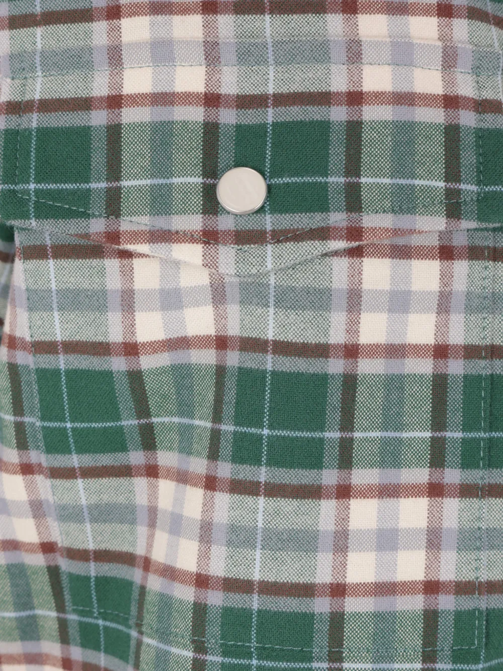 Зеленый и сливочно-белый клетчатый узор, классический воротник, застежка спереди на кнопки, накладные карманы на груди с клапанами, длинные рукава, манжеты на пуговицах