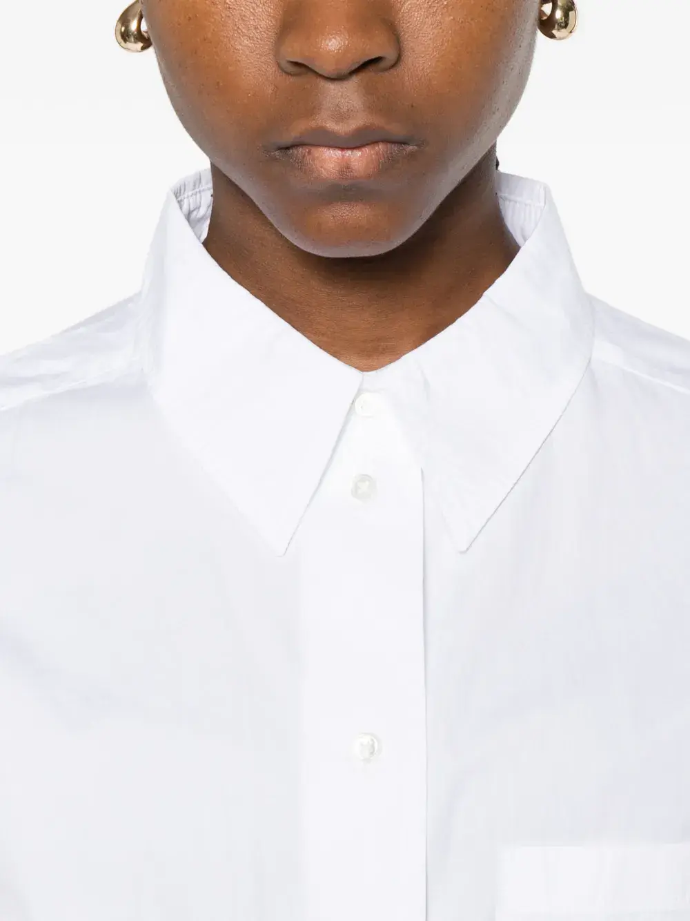 Белая рубашка с застёжкой на пуговицы спереди, нагрудным карманом, длинными рукавами с застёгивающимися манжетами и классическим воротником